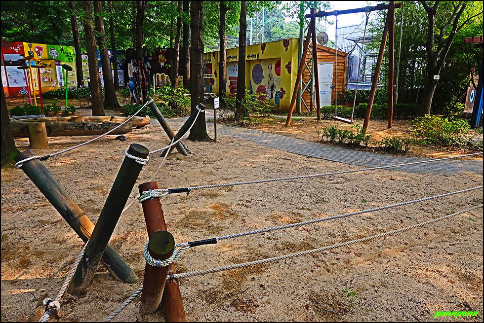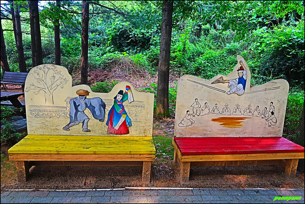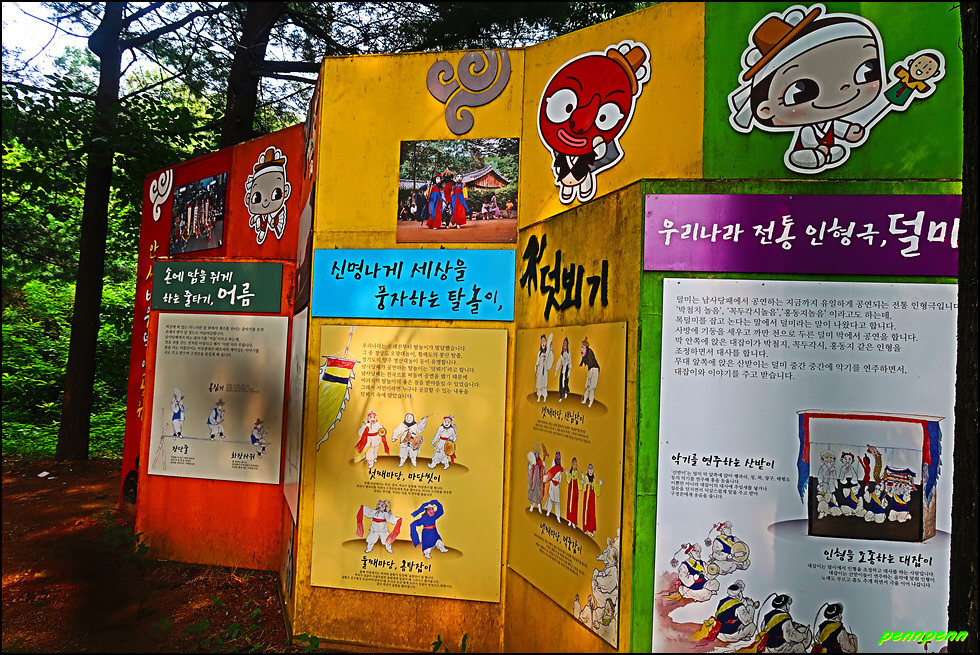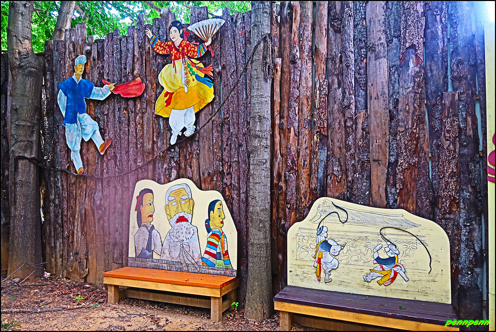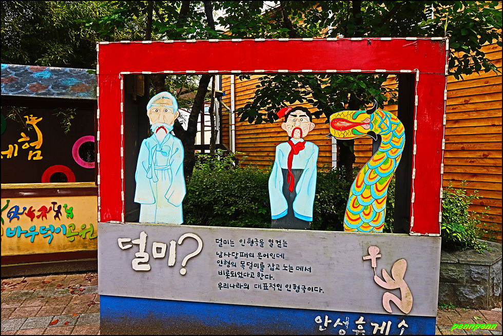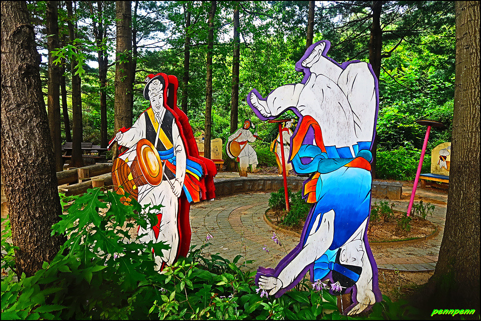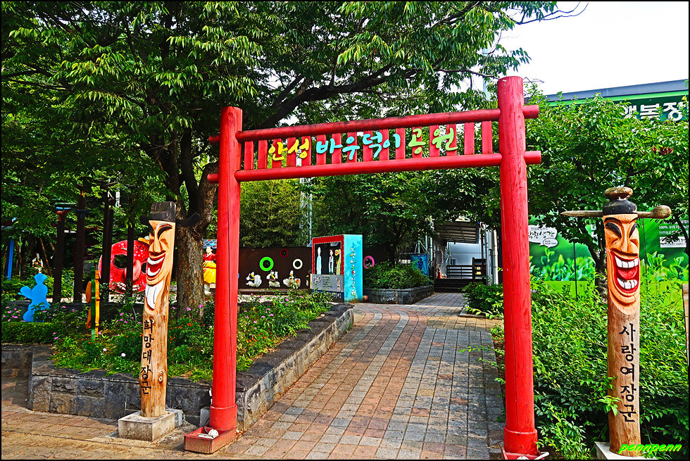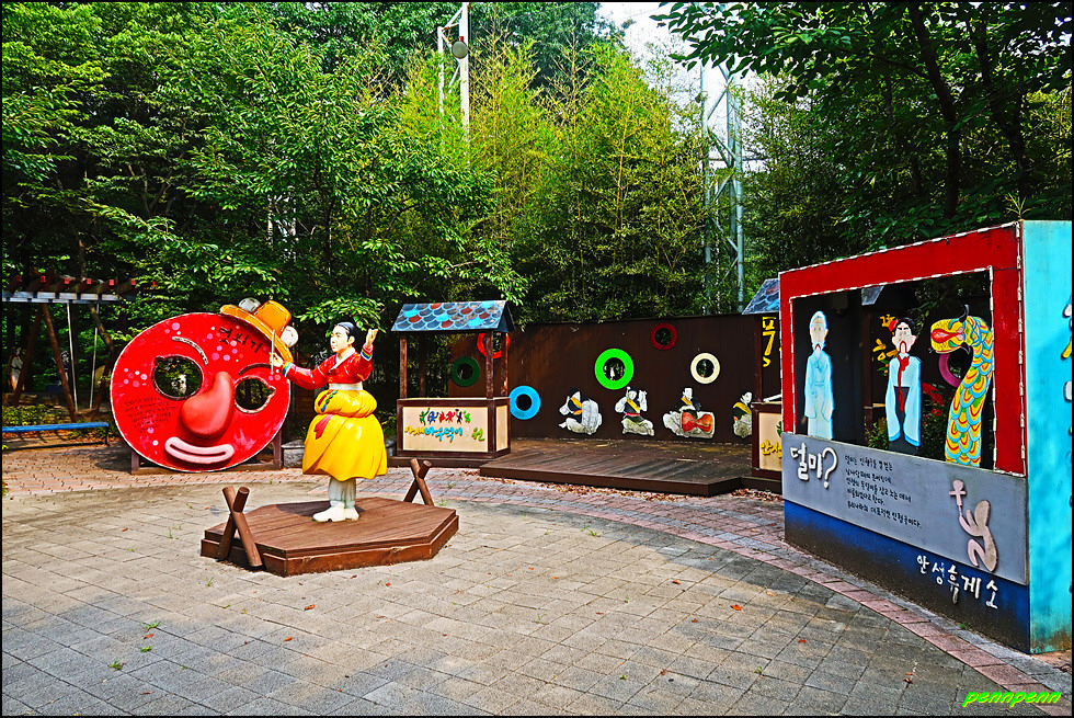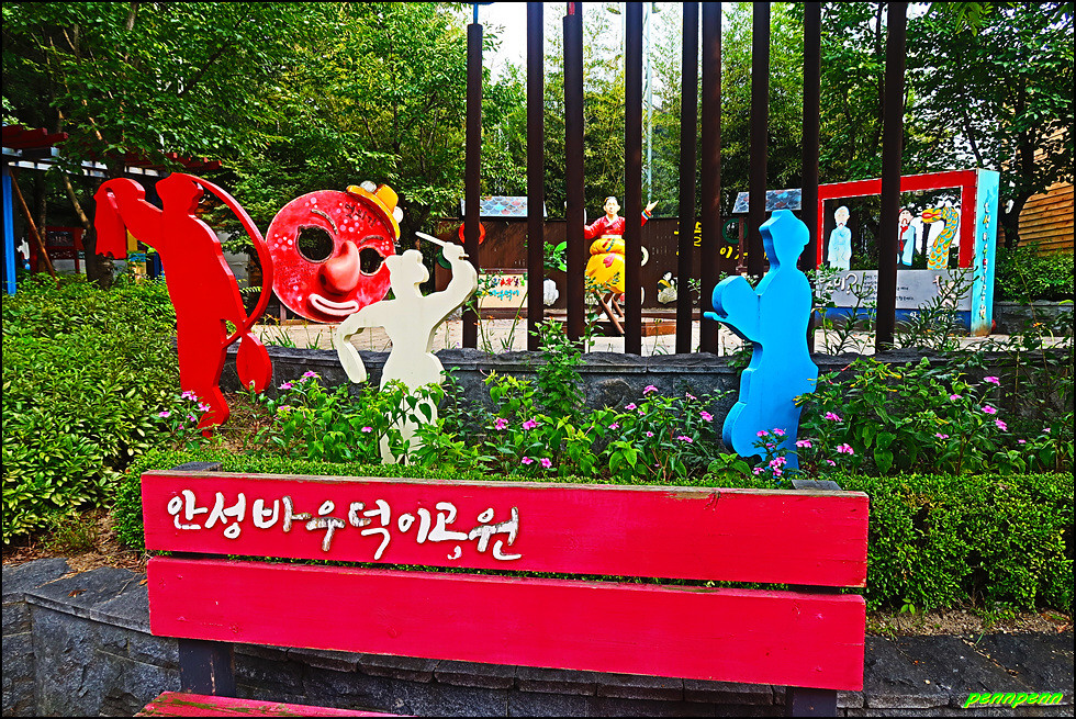 공원정문 양쪽에는 장승이 있고, 정문 좌측에는 솟대가 있습니다. 안으로 들어서면 바우덕이 상징조형물, 인형극 포토존, 남사당패의 탈놀이조형물, 풍물놀이체험존 등 다양하고 화려한 시설물이 보입니다.