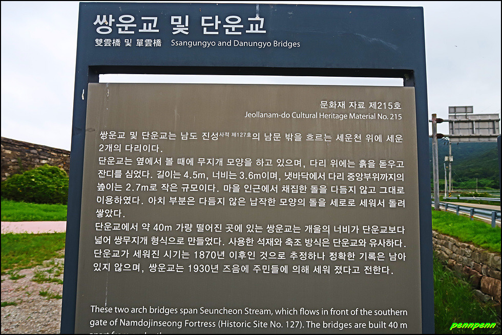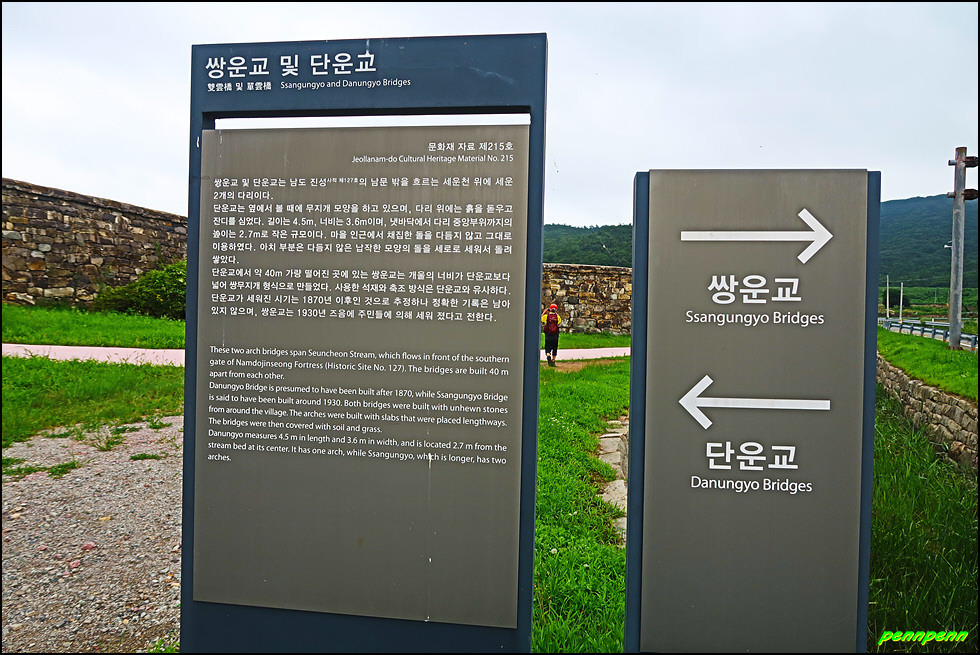 남도진성 남문 앞으로 흐르는 작은 개울 위에는 쌍운교(쌍무지개다리)와 단운교 두 개의 운교(무지개다리)가 놓여있는데, 두 개 모두 편마암질의 판석을 겹쳐 세워 만든 것으로 규모는 작지만 전국적으로 유례를 찾기 힘든 특이한 양식이라고 합니다. 특히 쌍운교 뒤로 보이는 남문은 남도진성의 대표사진으로 등장할 만큼 멋진 모습입니다.