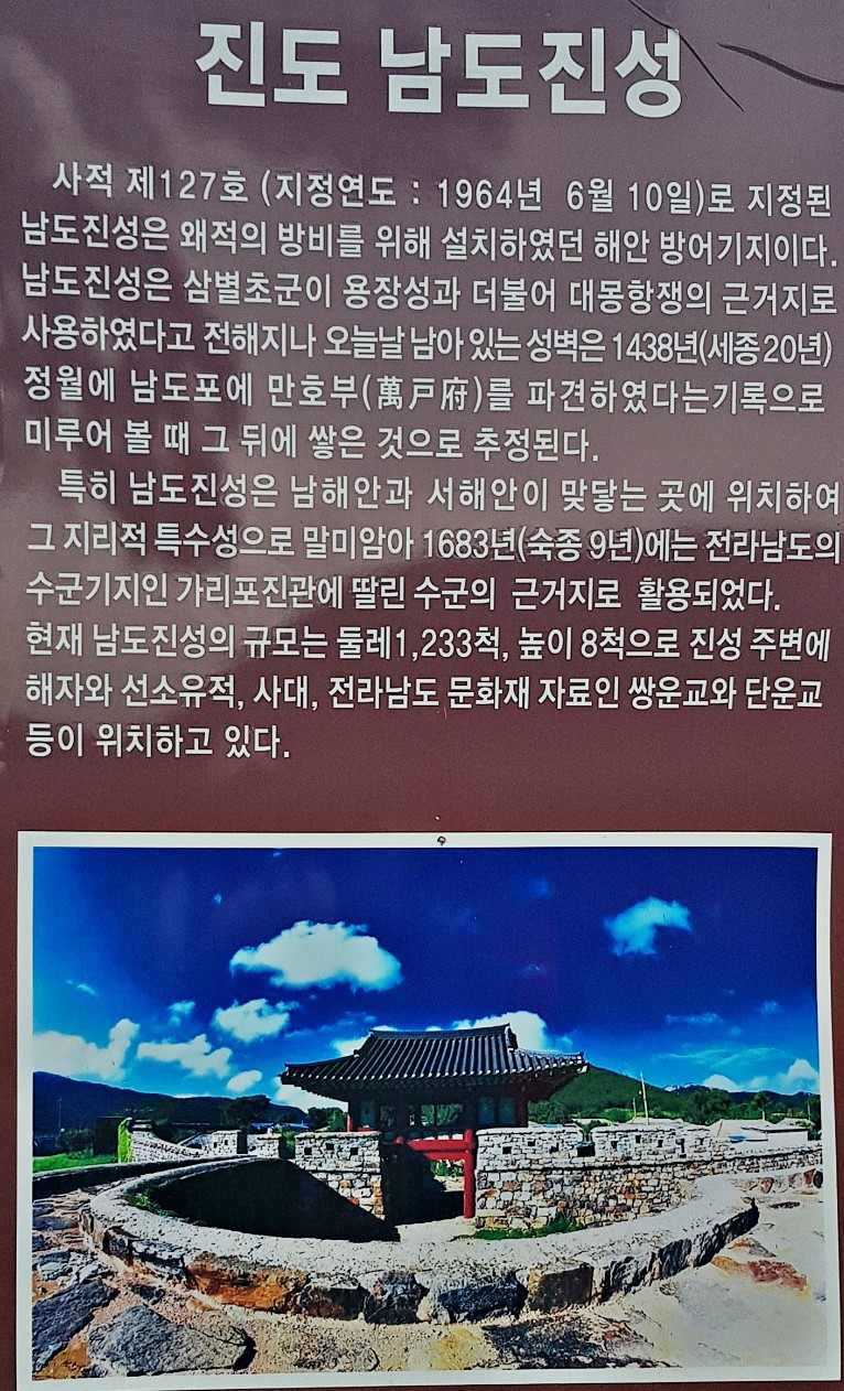 진도는 워낙 외진 곳이기에 유배지로도 활용되었고, 군사적 요충지라서 군사 관련 유적들이 많이 남아있습니다. 전남 진도군 임회면 남동리 소재 진도남도진성(당초 남도석성에서 명칭변경, 사적 제127호)은 고려 삼별초군이 몽고군과의 항쟁을 위해 쌓은 성으로 조선 세종 20년(1438) 왜구의 침입에 대비해 성을 보수한 것으로 알려져 있습니다. 현지 안내문에는 삼별초군이 대몽항쟁의근거지로 사용했다고 전해지지만 오늘날 남아 있는 성벽은 조선 세종 20년(1438) 남도포에 만호군을 파견했다는 기록으로 미루어 볼 때 이후 쌓은 것으로 추정한다는군요. 어떤 자료는 삼국시대의 백제가 쌓은 성으로 적고 있어 정확한 축조연대는 헷갈립니다.