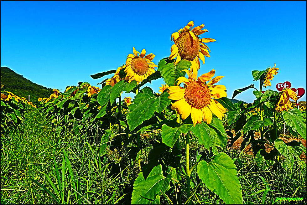 드디어 제방 남쪽에 조성된 해바라기단지가 보입니다. 교동면 난정리 소재 난정해바라기 정원은 난정저수지 일원 약 3만3천m² 부지에 조성된 해바라기 단지입니다. 이 해바라기 마을정원은 이곳 난정리 거주 100여 명의 주민이 마을공동체를 만들어 농사를 짓지 못하는 공유수면에 약 10만 그루나 되는 해바라기 밭을 조성한 것으로 초가을이면 해바라기들이 장관을 이루어 수도권 최대의 해바라기 명소로 자리매김해 많은 관광객이 찾는 명소입니다.