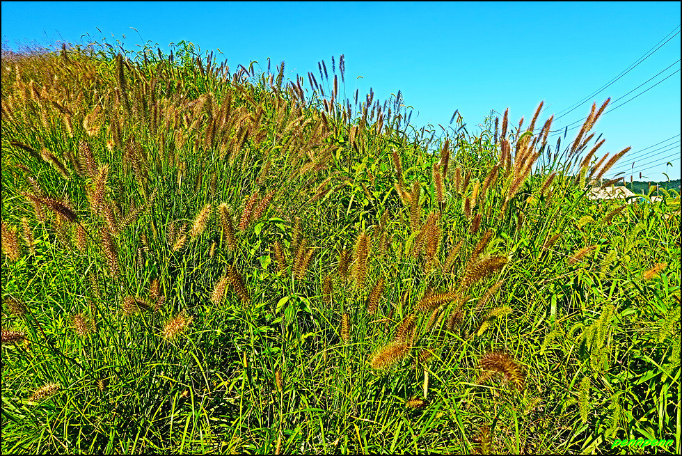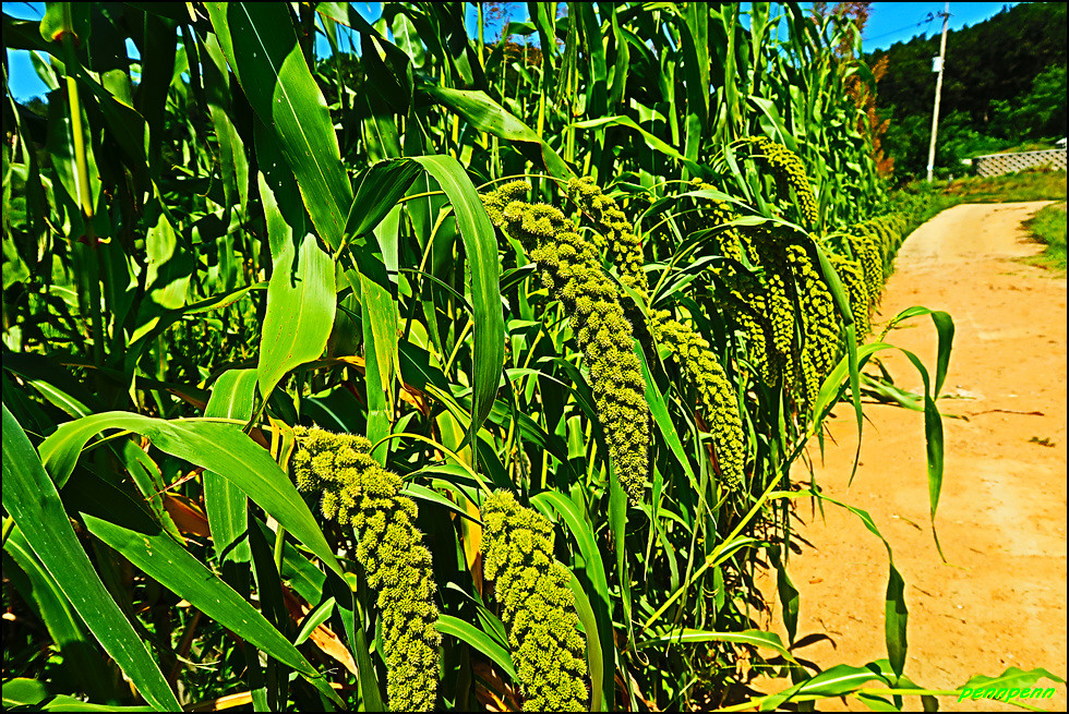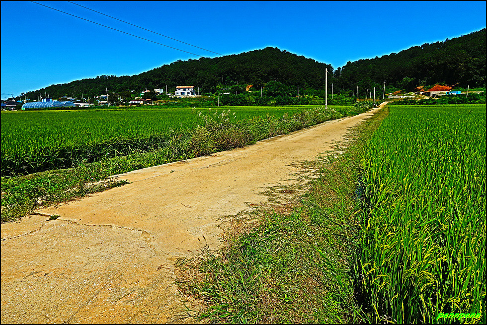 머르메에서 북쪽으로 방향을 돌립니다. 농로를 가노라니 수수와 조가 함께 자라고 있어 길손의 눈길을 사로잡습니다. 길은 좌측으로 구부러졌다가 급격하게 우측으로 전환해 언덕을 넘어갑니다. SK 양갑주유소와 양갑리 마을회관, 그리고 양갑교회를 지나 일직선 도로인 교동서로를 걸어갑니다. 황금들판 뒤로 화개산 정상이 보입니다. 유현정미소와 교동미곡종합처리장을 지나 계속 걸으면 출발지인 대룡시장입니다.