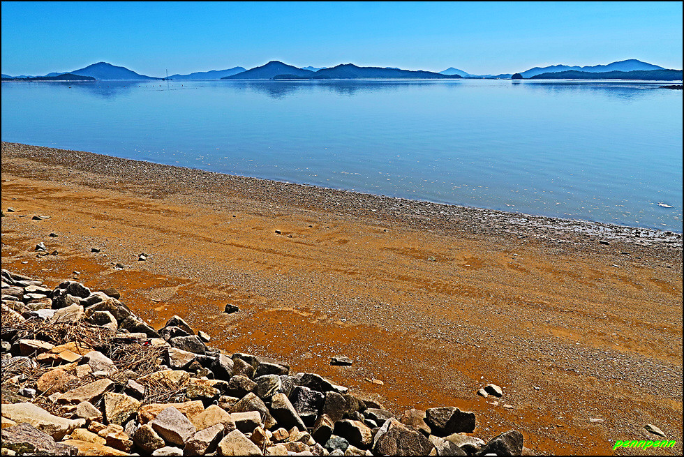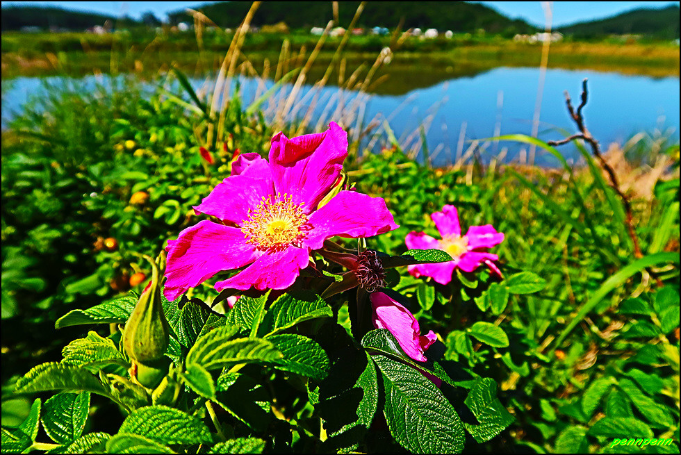 죽산포에서 계속 북동쪽 해변을 걸어갑니다. 방조제 안쪽에는 작은 저수지가 여럿 조성되어 있는 모습입니다. 지나가는 길손을 보며 목청이 터져라 개가 짖어대니 놀란 거위 4마리가 괙괙 소리를 지릅니다. 해당화 군락지에는 군계일학(群鷄一鶴)처럼 멋지게 피어 있는 해당화가 보입니다. 자금 걷는 이 길은 10코스의 이름을 낳은 머르메길이지만 길목에는 아무런 안내문이 없네요. 강화나들길 홈페이지를 보면 “머르메”는 동산리의 일부 자연부락으로 가장 큰 마을을 형성하여 두산동이라 하였는데 우리말로 “머르뫼”로 부르던 것이 와전되어 머르메로가 되었다는 게 전부입니다. 바닷가 갯벌에는 붉은 색의 해초가 무리를 지어 자라고 있군요.