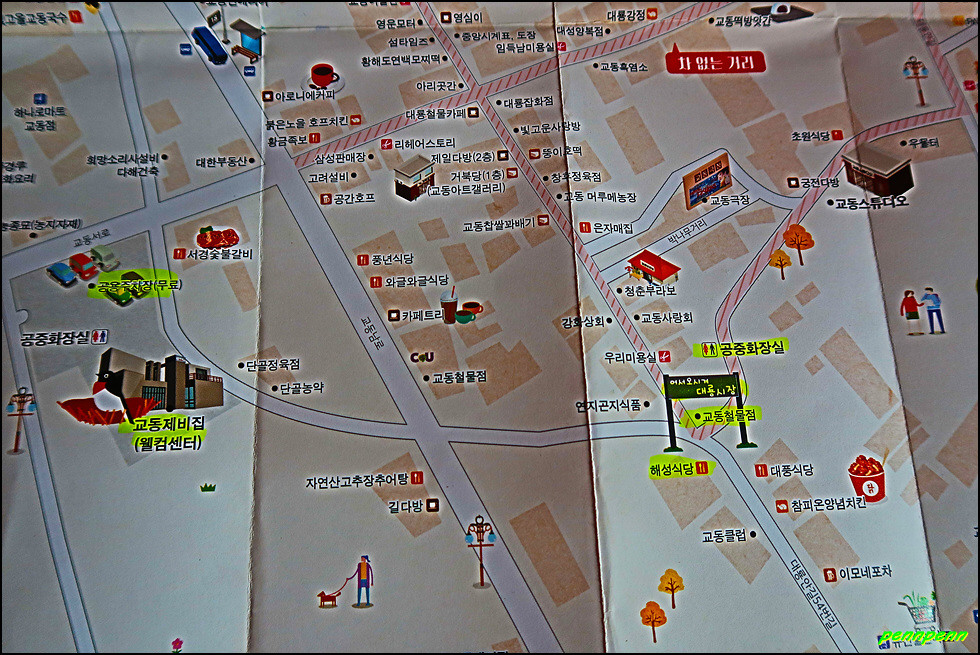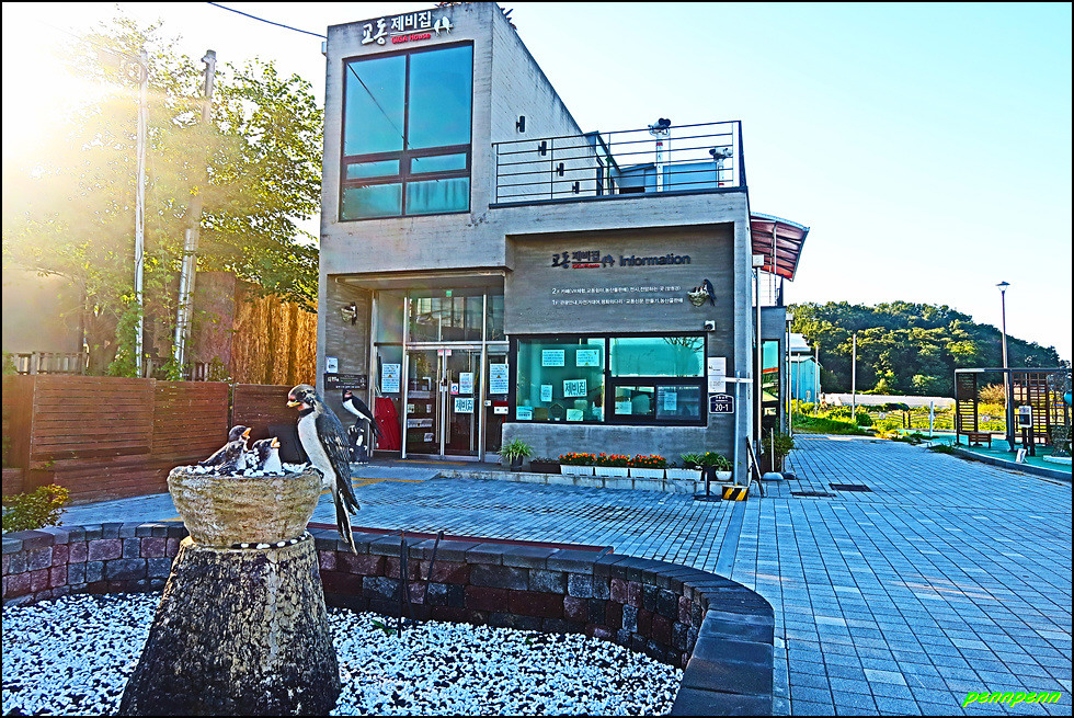 10코스를 시작하려면 대룡시장 앞 교동제비집(웰컴센터)을 찾은 것이 좋습니다. 공용주차장과 공중화장실 옆에 있는 교동제비집은 강화군에서 민자유치와 중앙 및 지방정부 협력으로 추진하는 “평화와 통일의 섬 교동도 프로젝트”의 거점시설로 주민이 직접 운영하는 안내소 겸 카페입니다. 이곳에 비치된 교동도 관광안내지도에는 대룡시장의 배치도가 상세하게 나와 있으며 10코스 완주도장함이 있는 해성식당의 위치도 알 수 있습니다.