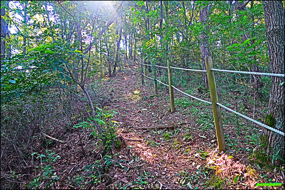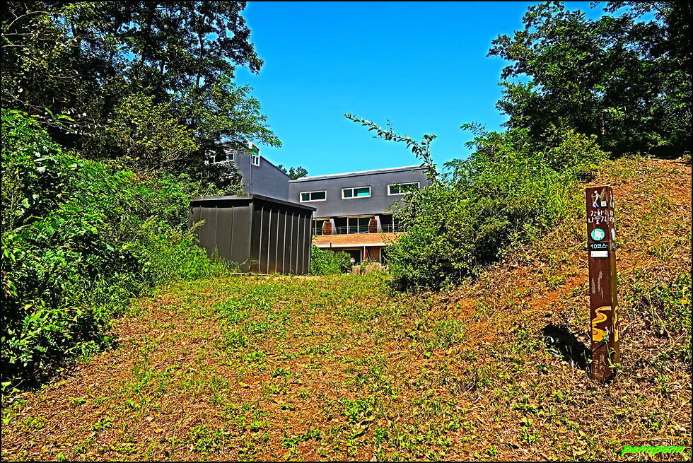 한증막을 뒤로하고 가파른 통나무계단을 오릅니다. 능선에서 좌측으로 300m 지점에 수정산 정상이 있다는 이정표가 있더군요. 정상이라고 추측되는 곳을 지났지만 아무런 이정표가 있습니다. 수정산(126m)은 해발고도는 낮지만 그래도 정상 이정표가 없는 것은 다소 섭섭합니다. 그런데 조금 더 전진하니 이번에는 수정산 정상을 1.5km 지나왔다는 황당한 이정표가 나옵니다. 하도 어이가 없어 입을 벌린 채 걸어가노라니 이번에는 수정산은 지난 지 500m라는 이정표가 있습니다. 그러고 보면 조금 전 1.5km는 아마도 150m의 오기였던 것 같습니다.