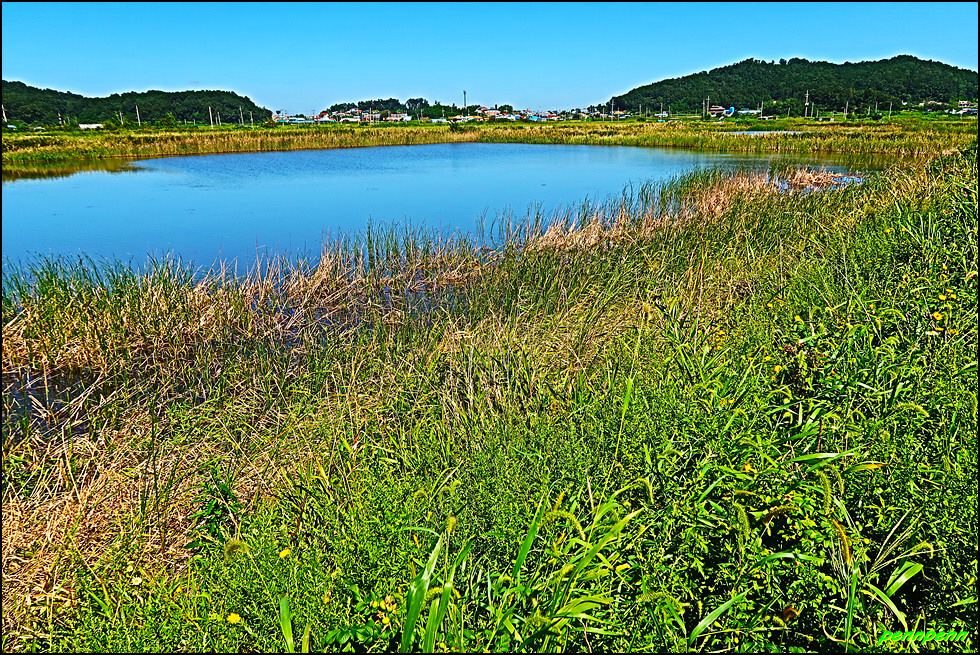 수로 옆 도로를 끝까지 걸어가면 난정저수지입니다. 교동면 난정리 소재 난정저수지는 농업용수개발을 위해 난정리와 무학리의 일부주민을 이주시키고 1991-2006기간 중 완공한 저수지로 총저수량은 620만 톤에 달합니다. 저수지 제방 위로 올라 남쪽으로 걸어갑니다. 제방에서 바라보는 저수지의 모습이 마치 바다 같습니다. 저수지의 둑에는 잡초가 많아 이슬에 젖은 물방울로 인해 바짓가랑이가 물에 젖을 지경입니다. 특히 스르륵 하고 지나가는 큰 뱀을 본 후로는 혹시나 뱀을 밝을까봐 노심초사하면서 발걸음을 옮깁니다.