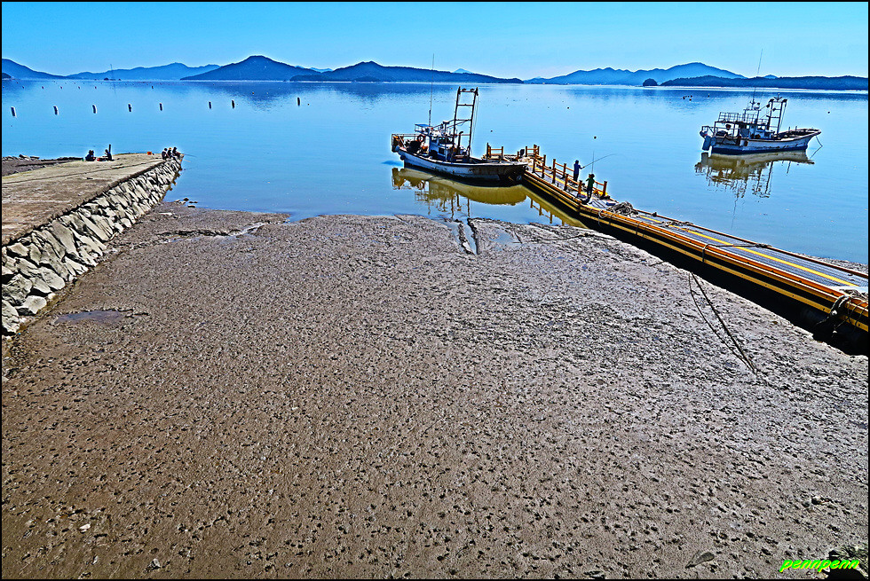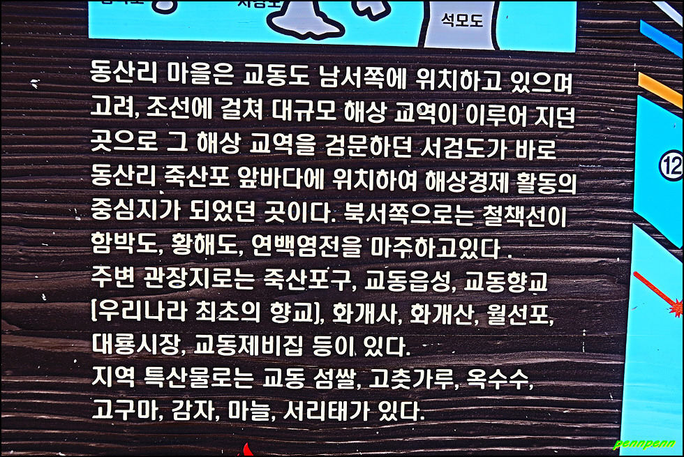 무성한 잡풀지대를 통과하니 바닷가입니다. 해변의 철조망이 점경지역임을 실감나게 만드는군요. 이제 해안선을 따라 조성된 둑길을 걸어갑니다. 남동쪽으로는 이름 모을 강화의 섬들이 펼쳐져 있군요. 태양열 주택이 있는 곳에서 좌측으로 우회해 다시 바닷가로 나가니 생태평화마을이라는 동산리 죽산포입니다. 교동도 남서쪽의 동산리마을은 고려 및 조선시대 대규모 해상교역이 이루어지던 곳으로 이곳 죽산포 앞바다는 해상경계활동의 중심지였다고 합니다. 죽산포는 옛날 이 포구에 배가 많이 정박해 배의 돛대가 마치 대나무 숯과 같다해서 붙여진 이름입니다. 현재는 파리를 날릴 정도로 매우 한산한 포구가 되었지요.
