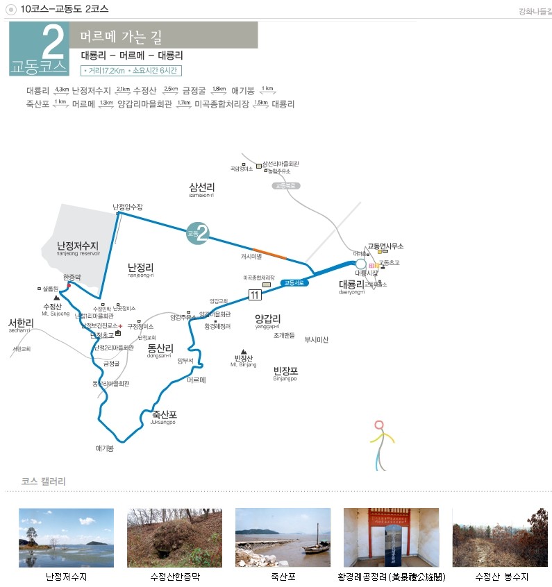 ▲ 코스 : 대룡시장(교동제비집)-교동서로-난정저수지(북단)-난정해바라기정원-수정산 한증막-수정산-해안철조망-동산리마을 죽산포-머르메-SK양갑주유소-양갑리 마을회관-양갑교회-대룡시장