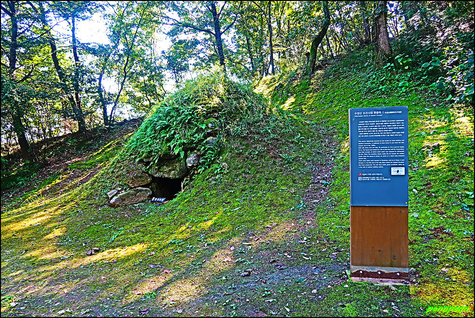 제방남쪽의 해바라기 단지를 둘러보면서 서쪽으로 가면 좌측으로 수정산 조선시대 한증막을 알리는 이정표가 나옵니다. 좌측으로 150m를 들어가면 수장산 중턱에 한증막이 있습니다. 수정산 한증막은 조선후기에 축조해 사용하던 민간목욕시설로 소나무 가지 등을 이용하여 불을 지펴 그 열기로 1960년대까지 한증을 했으며, 둘레 18km 높이 2.5m로 교동에서 유일하게 원형의 모습이 남아 있는 곳입니다. 그런데 그 당시 이곳에 거주하는 주민이 소수였을 텐데 이런 목욕시설(한증막)을 만들었다는 게 정말 경이롭습니다.
