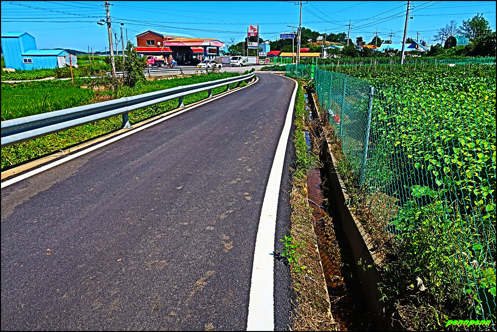 능선으로 이어지던 길은 종점까지 9.3km가 남은 지점에서 우측으로 방향을 전환해 내려오니 도로변에 서한리 마을표석이 있습니다. 강화나들길 이정표를 살 살피며 도로를 벗어나 우측으로 갑니다. 일직선으로 뻗은 농로를 거쳐 동산리 마을을 지나갑니다. 물길풍경 정원길은 자전거를 타고 가는 길이로군요. 10코스는 잠시 후 자전거길을 버리고 좌측의 임도로 이어집니다. 마침 맞은편에서 오는 두 명의 남녀가 필자에게 홀로 걸으면 심심할 텐데 같이 걷자고 하지만 이미 걸어온 방향으로 다시 갈 수는 없는 노릇입니다.