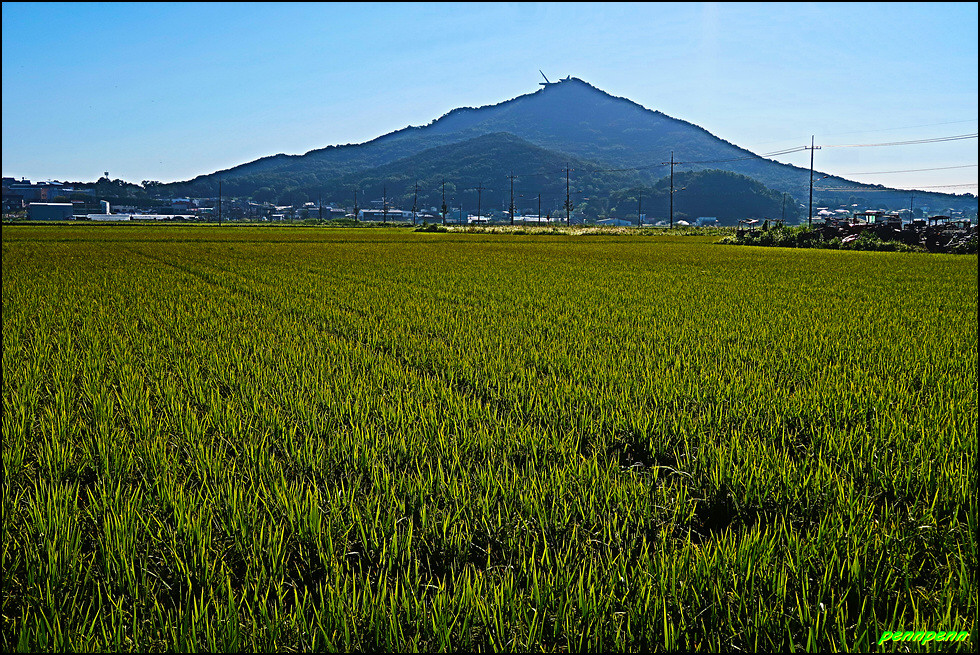 해성식당은 교동제비집 우측, 대룡시장의 남쪽 대문이 있는 곳에 위치하고 있지요. 이곳에서 인증 도장을 찍고 교동남로를 따라 우측으로 가면 교동서로와 만나는 사거리에 10코스 안내지도가 있습니다. 이제 일직선으로 조성된 교동서로를 따라 남서쪽으로 갑니다. 양갑교 앞 대동대리점이라는 붉은 건물에서 우측 수로변의 도로를 걷습니다. 오른쪽을 바라보면 교동도의 최고봉인 화개산(260m)이 우뚝한데 비행기 날개처럼 보이는 시설물은 공사 중인 화개산 전망대입니다. 벼 이삭이 영그는 논의 벼가 쓰러진 것은 이번 남부지방을 강타한 제11호 태풍 힌남노의 영향인지 잘 모르겠습니다.
