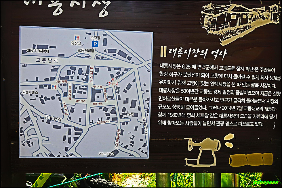 대룡시장 탐방은 어느 곳으로 들어가든 좋으며, 골목 곳곳에는 향수를 불러일으키는 벽화들과 조형물, 오래된 간판의 모습을 고스란히 지니고 있습니다. 골목의 모습을 사진으로 보여드립니다.