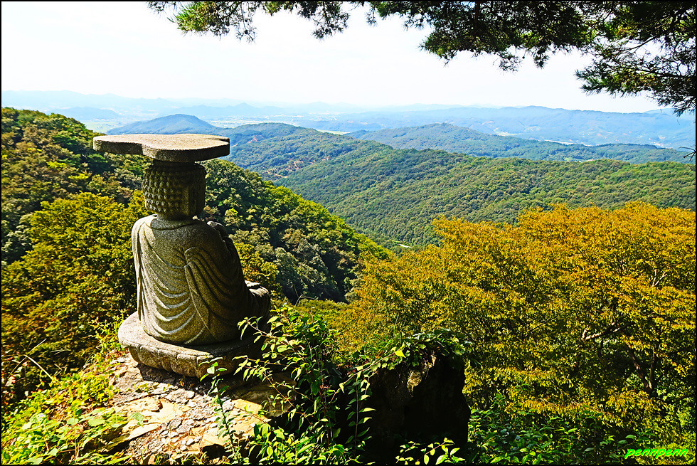 대웅전 우측에 조성된 가파른 계단 옆에는 큰 혈이 있으며, 계단이 워낙 가팔라 조심스럽게 올라야합니다. 이 계단을 오르면 석불좌상과 삼층석탑 그리고 나한전이 있는데요. 드디어 머리에 관을 쓴 석불좌상이 보입니다. 이 석불좌상은 눈이 오나 비가 오나 바람이 부나 사계절 이곳에서 어리석은 중생들이 아웅다웅하면서 살아가는 모습을 지켜보고 있습니다. 석불좌상 옆에는 삼층석탑이 있지요.