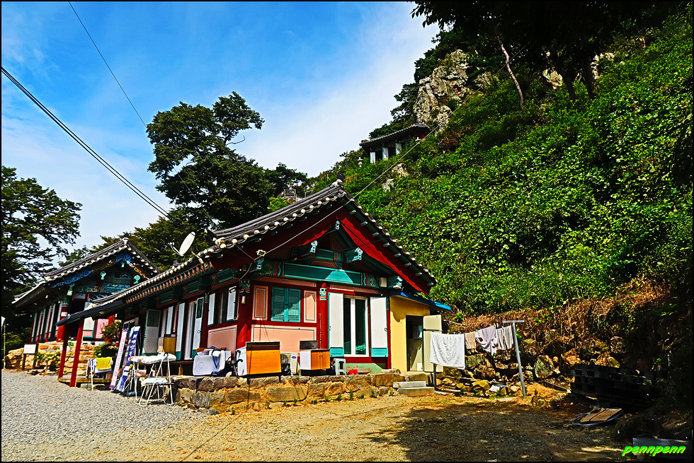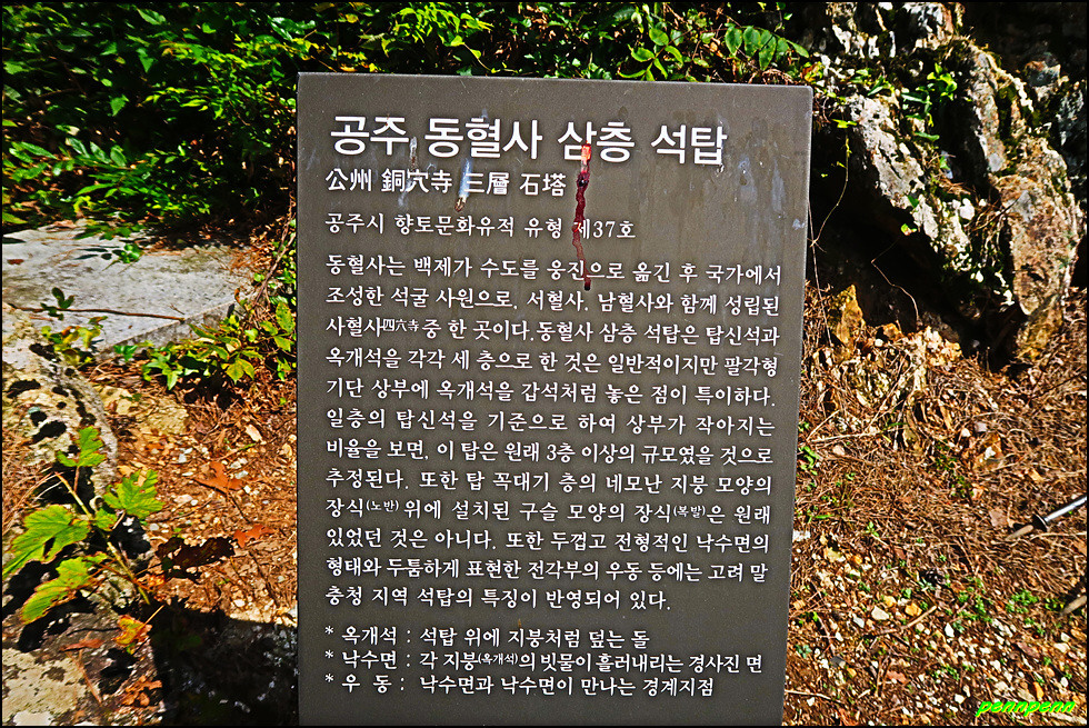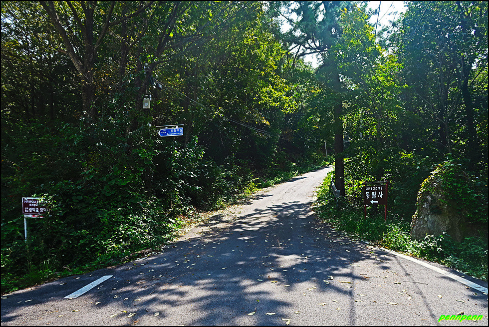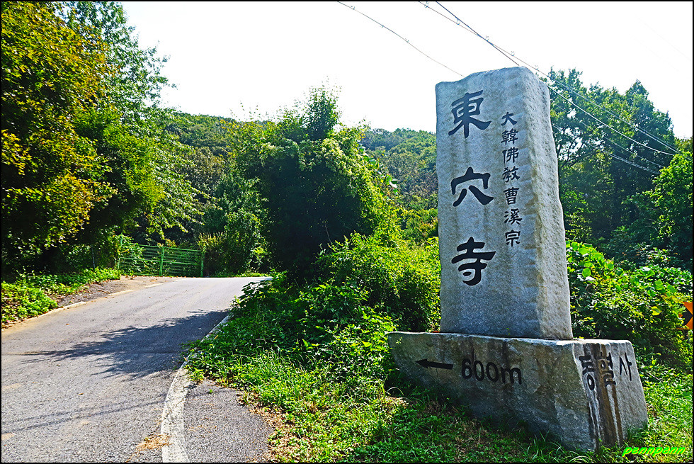 동혈사 북서쪽 동혈고개에는 대형 동혈사 표석이 있으며 여기서 약 600n를 오르면 동혈사입니다. 가파른 절벽에 조성되어 있는 동혈사의 모습이 아슬아슬해 보입니다.