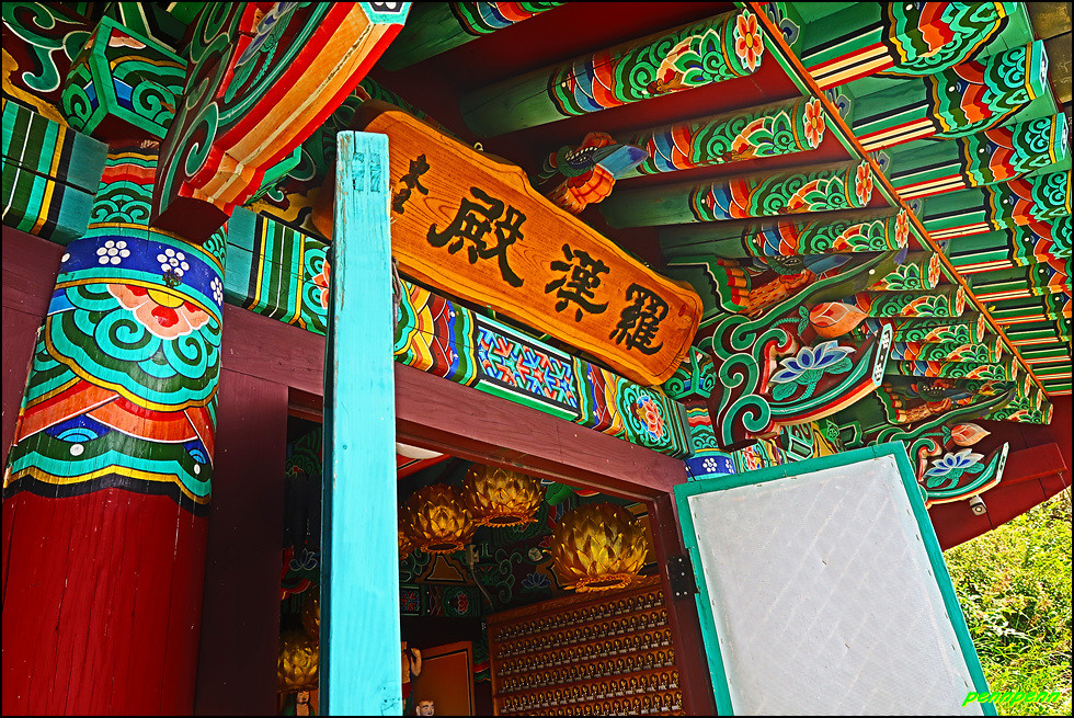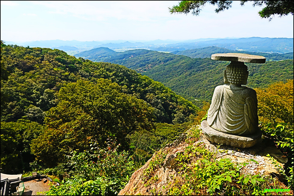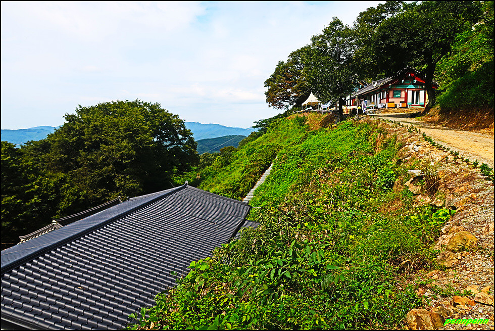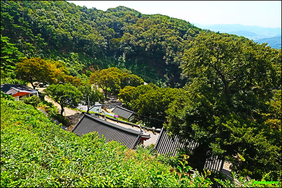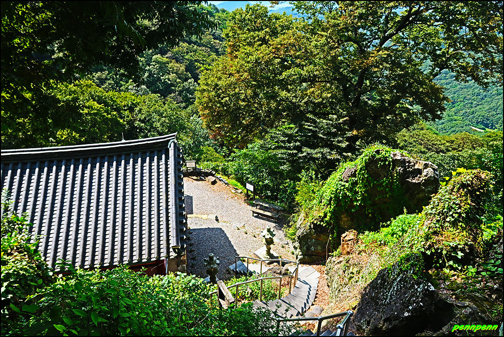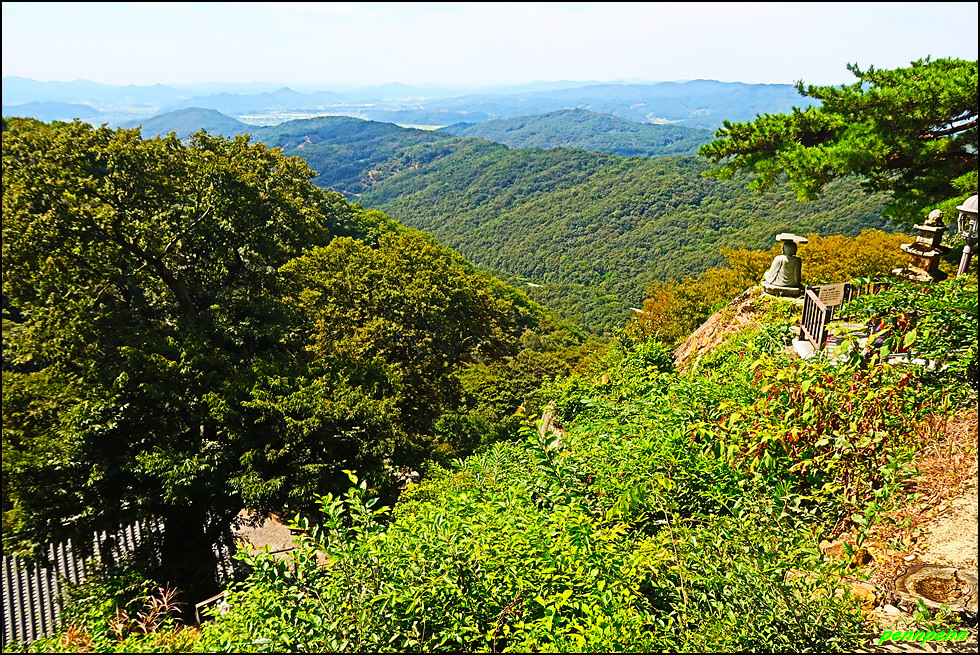 삼층석탑 위쪽에는 나한전이 있습니다. 나한전은 석가모니를 주불로 하여 좌우에 석가모니의 제자 가운데 16나한을 봉안합니다. 나한전은 500나한상을 모신 오백나한전과 16나한상을 모신 응진전으로 구분되는데, 우리나라에서는 오백나한이 중생에게 복을 주고 소원을 성취해 준다고 믿어 많은 나한전이 생기게 되었습니다. 나한전에서는 종무소와 대웅전의 지붕만 보이며, 삼층석탑과 석불좌상 뒤로 보이는 조망이 정말 빼어납니다.