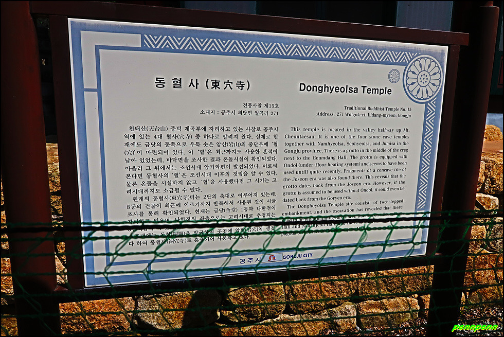 동혈사는 충청남도 공주시 의당면 월곡리 소재 천태산(392m) 중턱에 자리하고 있으며, 대한불교조계종 제6교구 본사 마곡사의 말사로 백제시대에 창건되었다고 전해지는 천년고찰입니다. 동혈사는 백제가 수도를 옹진으로 옮긴 후 국가에서 조성한 석굴사원으로 동혈사라는 이름에 동녘 동(東)자와 구리 동(銅)이 혼용되고 있는데, 동서남북의 혈(穴)에 위치하여 서혈사, 남혈사 등과 함께 우리나라에 풍수사상이 널리 유행하면서 세워졌을 법한 사찰로 이러한 흔적은 현재의 사찰 아래쪽 동혈사터(東穴寺址)에 남아 있다고 합니다.