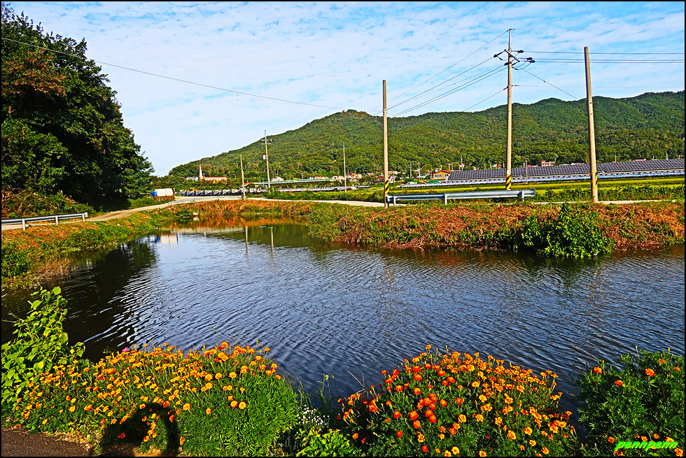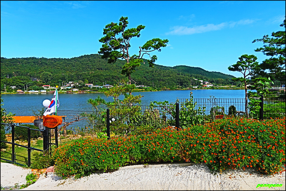 양오저수지는 지도상에 그 이름만 보일 뿐이지만 규모가 상당히 커 보입니다. 자료를 검색해 보니 양오저수지는 양오낚시터로 더 잘 아려져 있더군요. 그래서인지 저수지 가장자리에는 낚시전용시설물이 많이 있습니다. 실제로 낚싯대를 드리운 강태공의 모습도 보이네요. 길섶에는 붉은 색의 프랜치 매리골드가 아름답게 피어 있습니다.
