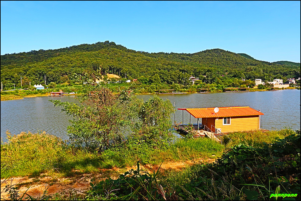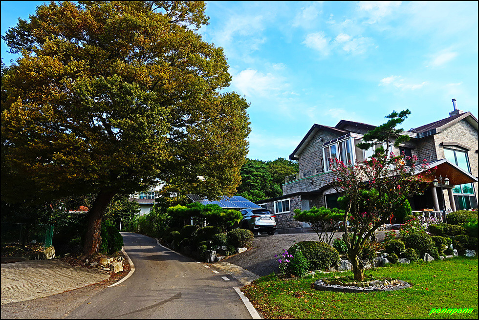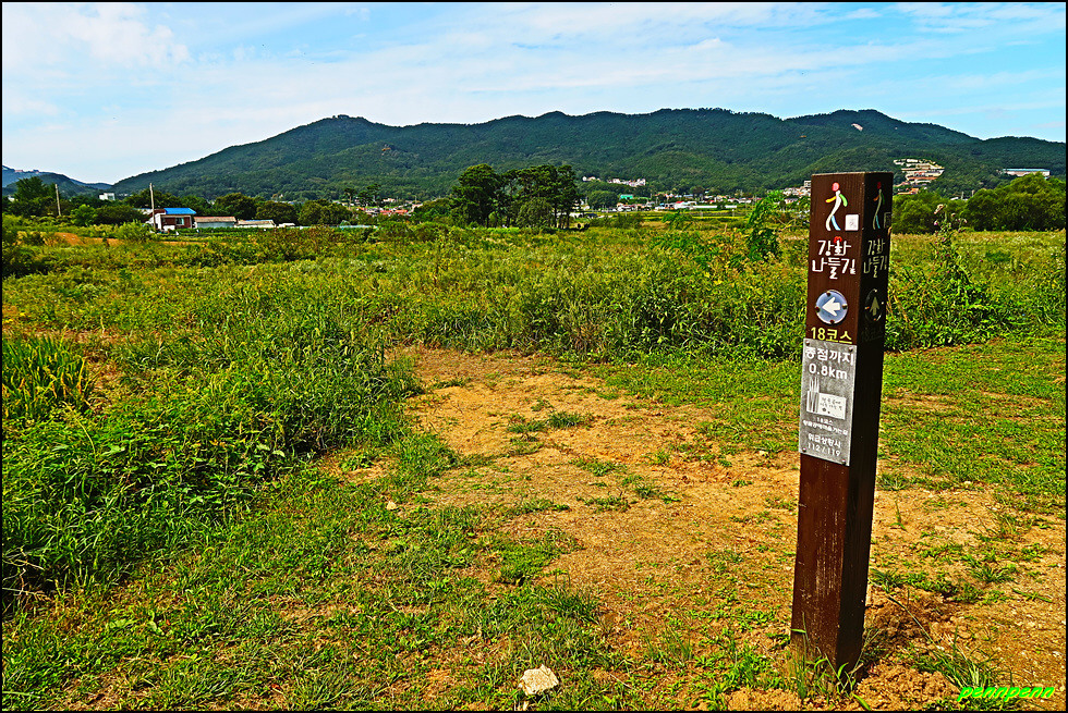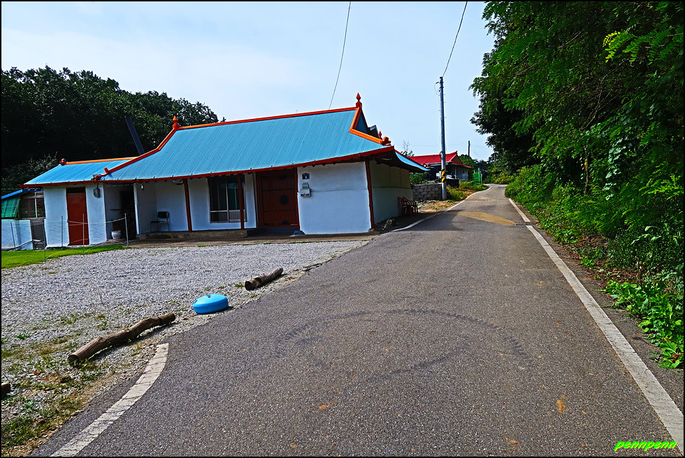 이제부터는 지루한 도로를 걸어야 하는 따분한 여정입니다. 도간마을, 장정2리마을회관, 인천대검도수련원 버스정류소를 지나 코스모스가 하늘거리는 구간을 거쳐 좌측의 좁은 도로로 진입합니다. 가까이에서 사격훈련을 하는 총소리가 자주 들려 이곳이 접경지역임을 실감하네요. 인적이 없는 호젓한 길을 걸으니 어느새 양오리마을과 양오저수지입니다.
