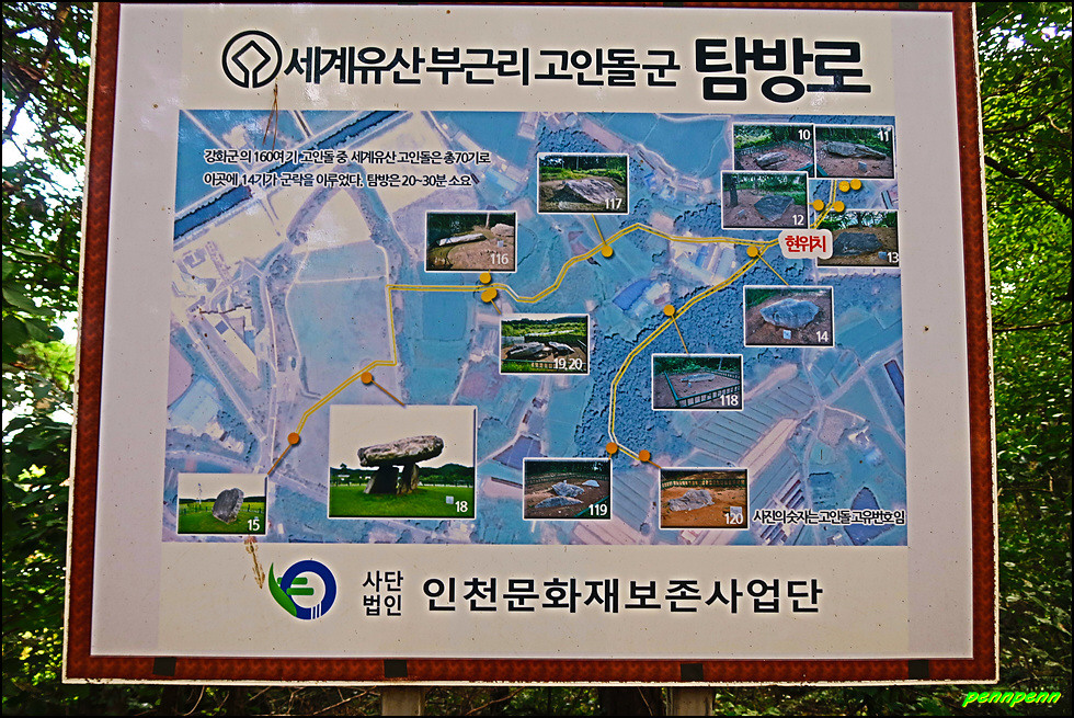 화문석문화관을 나와 남쪽으로 들판을 통과합니다. 간혹 갈림길에서는 이정표 또는 리본이 보이지 않아 길이 헷갈려 주변을 잘 살펴야합니다. 푸른 기와지붕의 민가를 지나 우측으로 진입하면 숲으로 이어지는데, 한참동안 숲길을 걷다보면 부근리고인돌군의 고인돌이 나타납니다. 길목에 있는 2기의 고인돌을 보고는 발걸음을 옮기니 부근리고인돌군 분포도가 나옵니다. 강화군 소재 고인돌 160여기 중 세계유산고인돌은 총 70기이며, 이곳에 있는 고인돌은 모두 14기입니다. 좀 더 앞으로 가면서 4기의 고인돌을 추가로 만나 모두 6기를 직접 보고는 고인돌광장으로 갑니다.