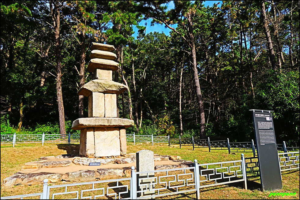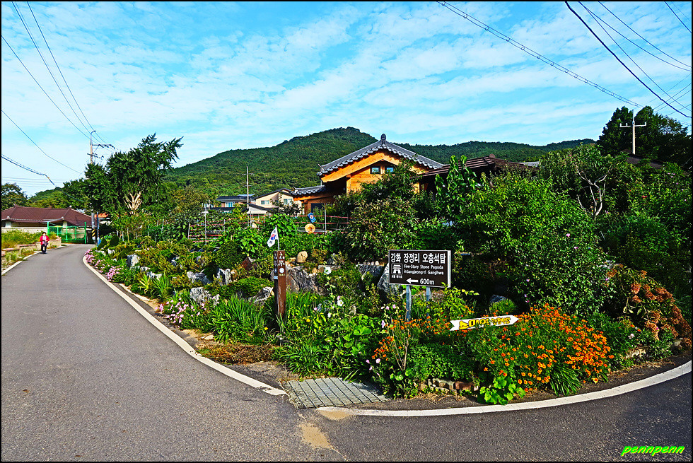 장정1리마을회관과 하점성당 사이의 도로를 따라 북쪽으로 걸으면 장정리 오층석탑까지의 거리가 600m라는 이정표가 길을 안내하는군요. 길섶에는 다른 지방에서는 이미 지고 없을 분홍색 낮달맞이꽃이 화사하게 피어 있습니다. 마을을 뒤로하고 숲속 도로를 가다가 주차장이 있는 곳 언덕위에 보물인 강화 장정리 오층석탑이 있습니다.