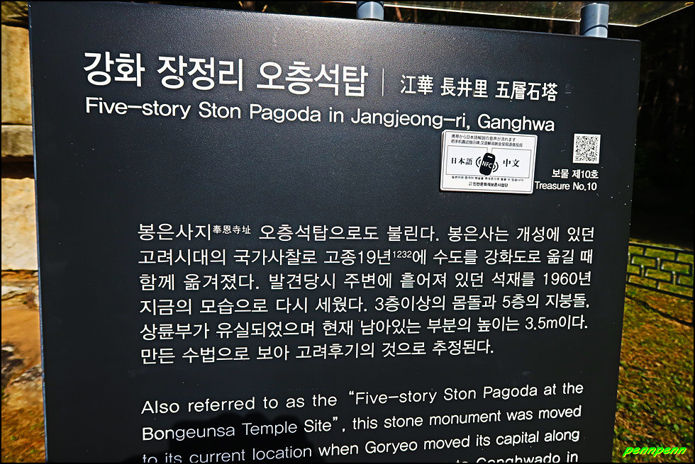 인천광역시 강화군 하점면 장정리 소재 장정리 오층석탑(보물 제10호)은 고려시대의 석탑으로서 봉은사지 오층석탑이라고도 불리는 이 탑 주위에 고려시대 사찰인 봉은사가 있었다고 전하나 현재는 없어지고 터만 남아있습니다. 봉은사는 개성에 있던 고려시대 국찰로 고종 19년(1232)에 수도를 강화도로 옮길 때 함께 옮겨졌습니다. 오층석탑은 발견 당시 주변에 흩어져 있던 석재를 수습해 1960년 지금의 모습으로 다시 세웠습니다.