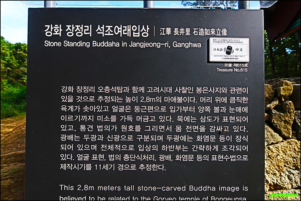 숲길을 이리저리 거닐다가 밝은 공터로 나오니 바로 장정리 석조여래입상입니다. 인천광역시 강화군 하점면 장정리 소재 석조여래입상(보물 제615호)은 고려 후기에 조성된 불상으로서 두꺼운 화강암 판석에 조각된 것입니다. 불상의 전체 높이는 3.26m, 불상 높이는 2.82m입니다. 불상이 있는 봉천산(奉天山) 정상에는 하늘에 제사를 지내는 봉천대(奉天臺)가 있습니다.