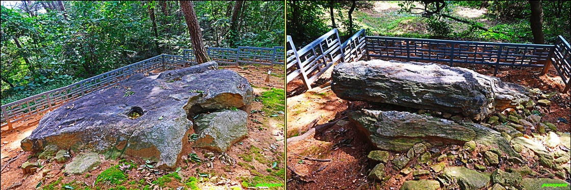 고인돌 광장에 있는 유적 중 가장 중요한 것은 강화지석묘라고 불리는 고인돌입니다. 강화지석묘는 탁자식고인돌 중에서 가장 크고 늠름해 교과서에 대표적인 고인돌로 소개되는 문화재로서 덮개돌의 무게만도 53톤에 달한다니 그 규모를 짐작할 수 있지요. 이 지석묘도 부근리 고인돌군에 포함된답니다. 반면 이 근처에 있는 다른 고인돌은 하도리 오류내 고인돌인데, 원래 하도리에 있다 분실된 것을 되찾아 이쪽으로 이전한 것이라고 합니다. 여기서 조금 가면 출발점인 주차장 입구입니다.