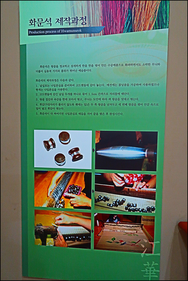 강화도에서만 생산되는 순백색의 왕골로 만들어진 꽃무늬 돗자리를 화문석(花紋席)이라고 합니다. 전국 유일의 왕골공예품인 강화 화문석은 고려시대부터 전수된 생활문화 유산으로 강화군에서만 생산되는 자랑스러운 민족문화유산입니다. 인천광역시 강화군 송해면 양오리 소재 화문석문화관은 화문석의 발상지인 이곳에 민족문화 유산을 계승해 발전시키고 고려시대부터 이어 온 강화의 화문석 및 왕골 공예품을 연구ㆍ전시하기 위하여 2005년에 개관한 전문전시관입니다.