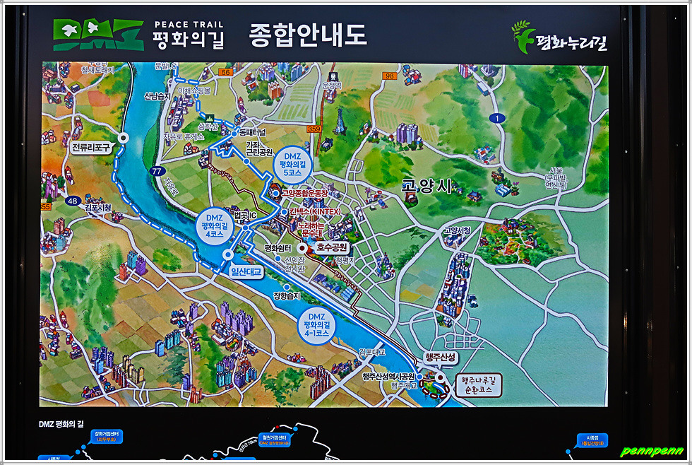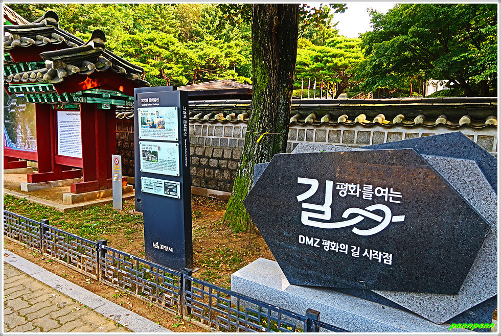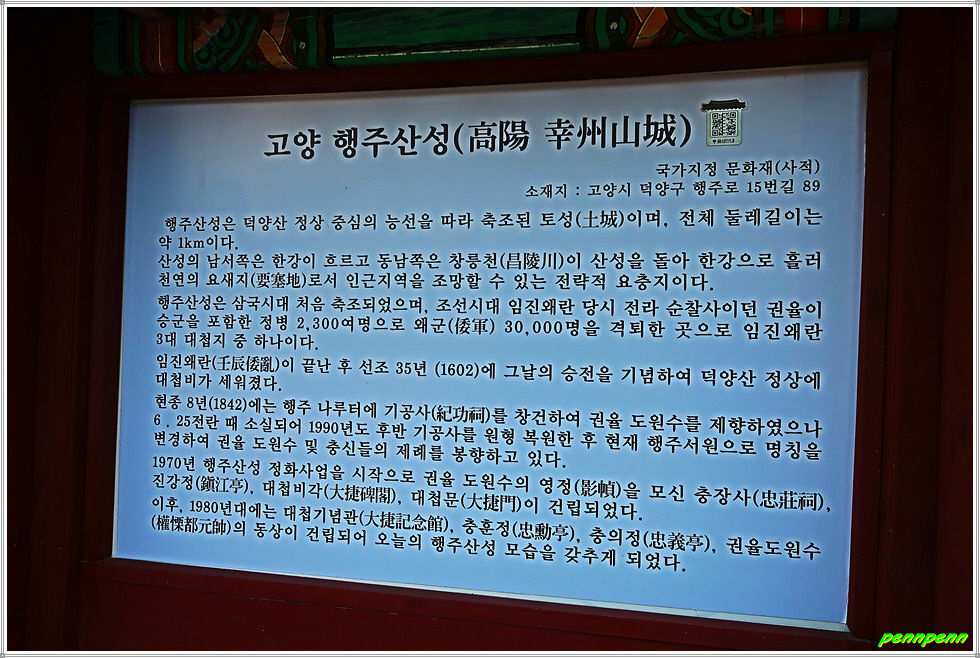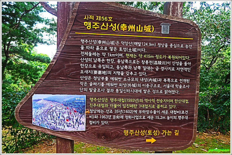 밖으로 나오면 정문인 대첩문입니다. 대첩문 앞에는 행주산성 안내문이 보이는군요. 또한 이곳이 “DMZ 평화의 길” 시작점이라는 표석이 놓여 있습니다. DMZ 평화의 길은 DMZ 인근에 분단의 현장과 뛰어난 생태.문화.역사자원을 생생히 체험할 수 있는 한반도 동서횡단 보도여행길로서 10개 시군을 이어주며 거리는 524km에 달합니다. 이 길은 강화에서 출발해 김포와 고양을 거쳐 강원도 고성까지 연결됩니다.