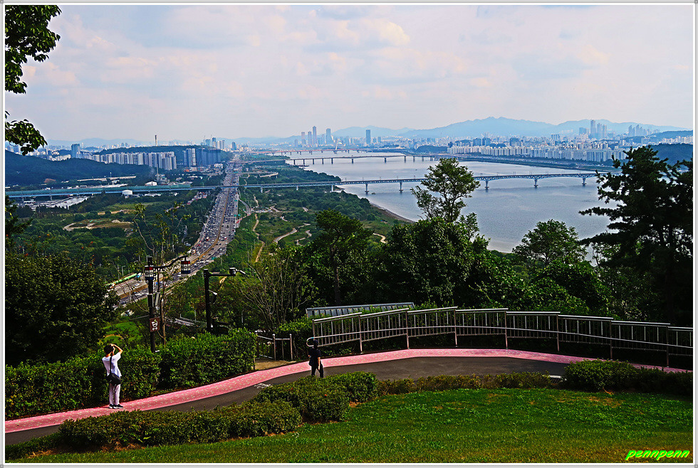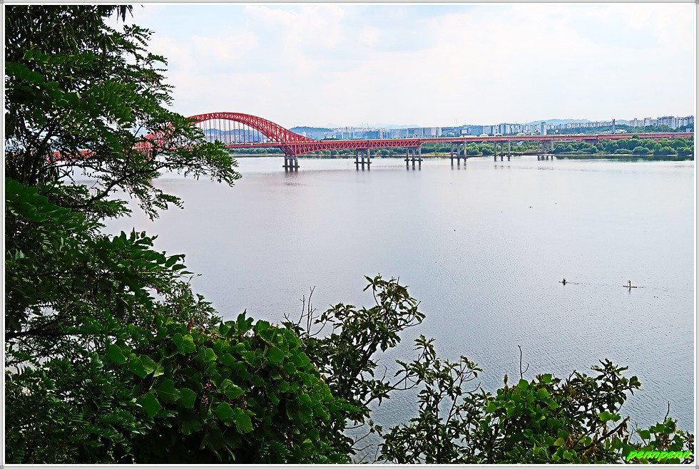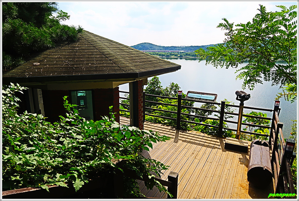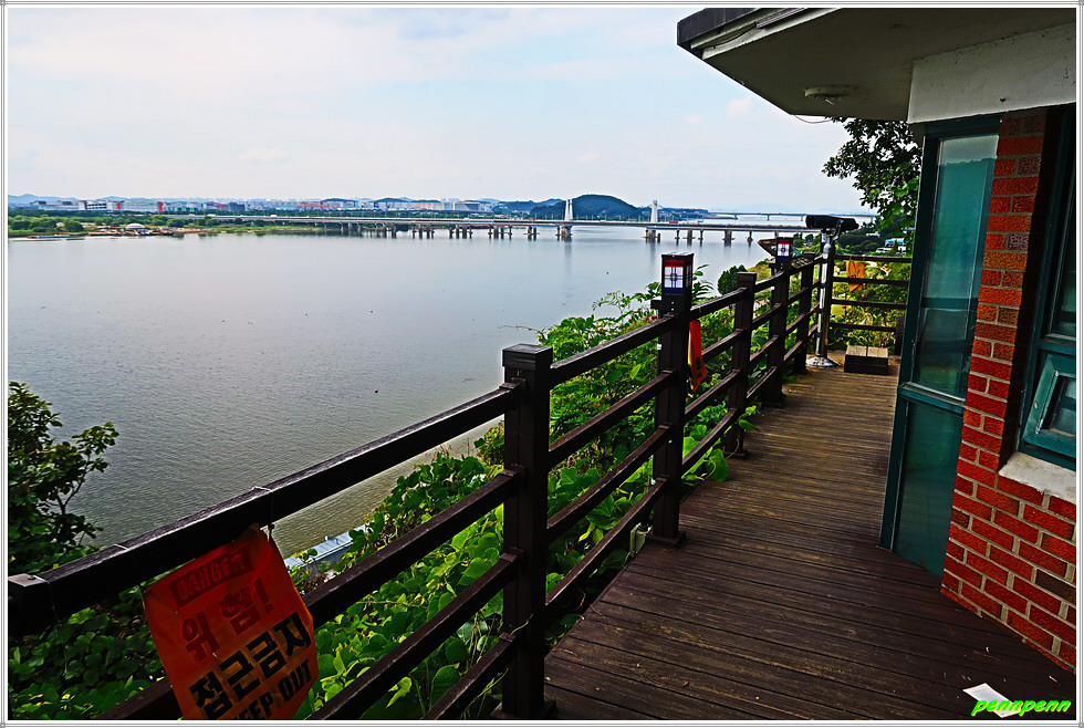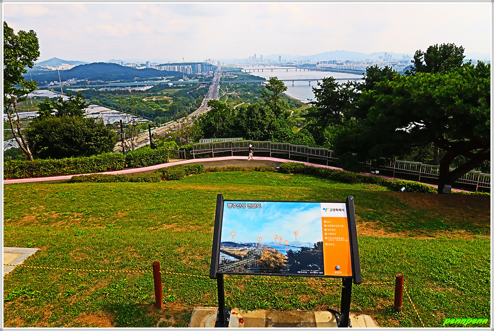 출입문이 달린 곳은 행주산성 내부노선인데 이 노선은 행주산성 휴무일인 월요일에는 출입이 제한된다는군요. 이 문을 통과해 위로 오르면 진강정입니다. 진강정은 경치를 감상할 수 있는 정자이지만 지금은 수목의 잎이 무성해 바깥경치가 보이지 않습니다. 진강정에서 위쪽으로 100여 미터 오르면 행주산성 정문에서 오르는 차도(넓은 길)와 만나는데 여기서 조금 더 오르면 덕양정입니다. 덕양정에서는 동남쪽으로 강변북로로 이어지는 자유로가 잘 조망됩니다.