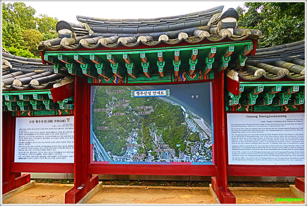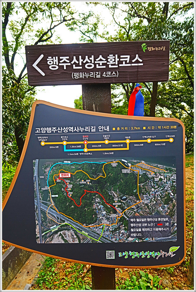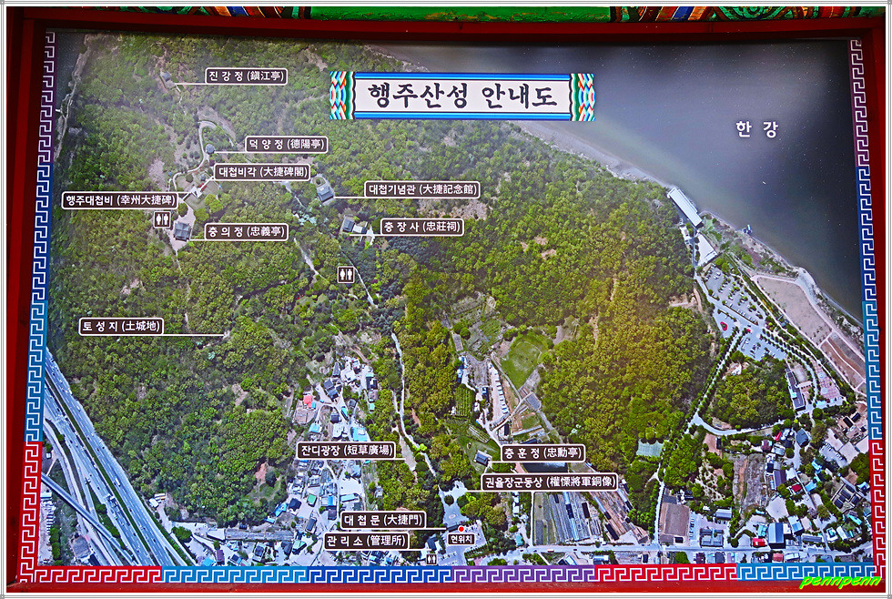 ▲ 코스 : 고양인재교육원-팔각정 초소 전망대-진강정-덕양정-대첩비각-행주대첩비-충의정-대첩기념관-삼도삼문-쉼터사진관-권율도원수 동상 -대첩문-고양인재교육원