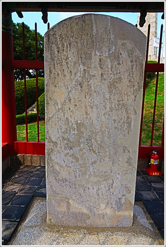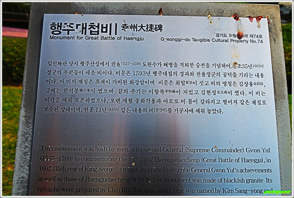 덕양정 위쪽에는 행주대첩을 기념하는 대첩비각과 행주대첩비가 있는데, 행주대첩의 전승을 기념하는 비석은 모두 세 개(초건비, 중건비, 행주대첩비)입니다. 이곳 대첩비각에 있는 비석은 초건비로 제일 먼저 제작된 비석인데, 1602년 장군의 휘하장수들이 새긴 첫 번째 비석으로 당대 최고의 문장가인 최립이 비석의 앞면 글을 짓고, 한석봉이 글씨를 썼다고 합니다.