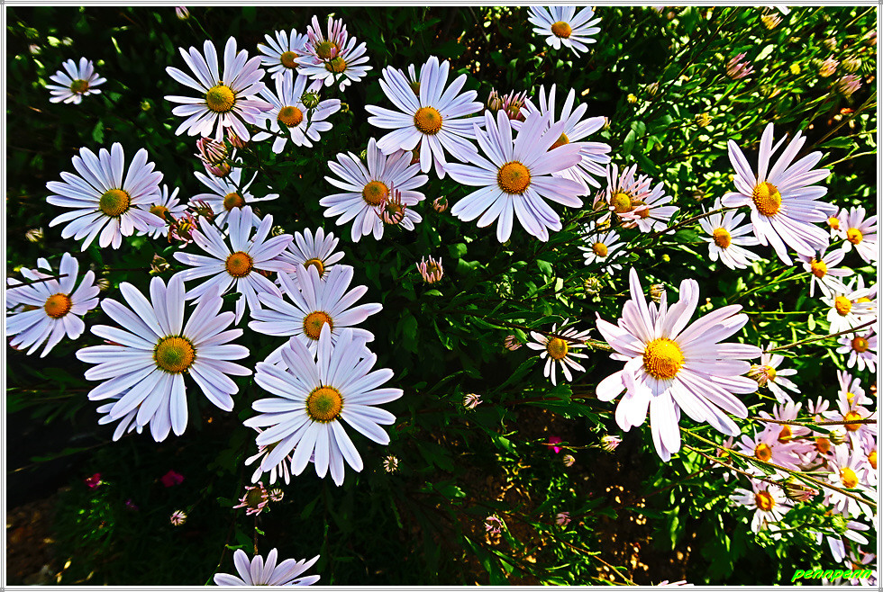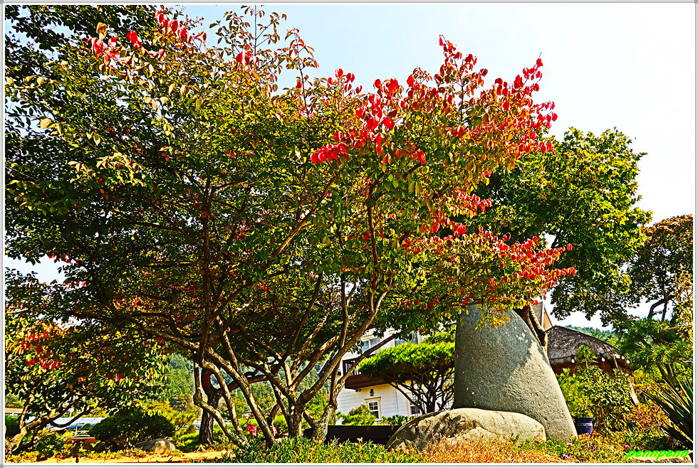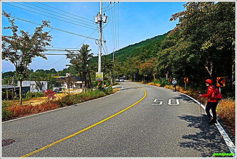 하늘을 찌를 듯한 침엽수립지대를 지나 고도를 낮춘 개치고개에서 국사봉 능선을 벗어나 좌측으로 조금 내려서면 571번 지방도로가 지나는 토방대입니다. 그런데 개치고개에 아무런 이정표가 없는 게 매우 아쉽더군요. 토방대에서 도로 좌측의 주촌마을로 갑니다. 길섶의 감나무에는 누렇게 익은 감이 주렁주렁 달려 있고 가을의 전령인 코스모스도 하늘거리고 있습니다. 구절초도 다소곳하게 피어 있는 가운데 성급한 단풍나무는 벌써 붉은 옷으로 갈아입을 채비를 하는 중입니다.