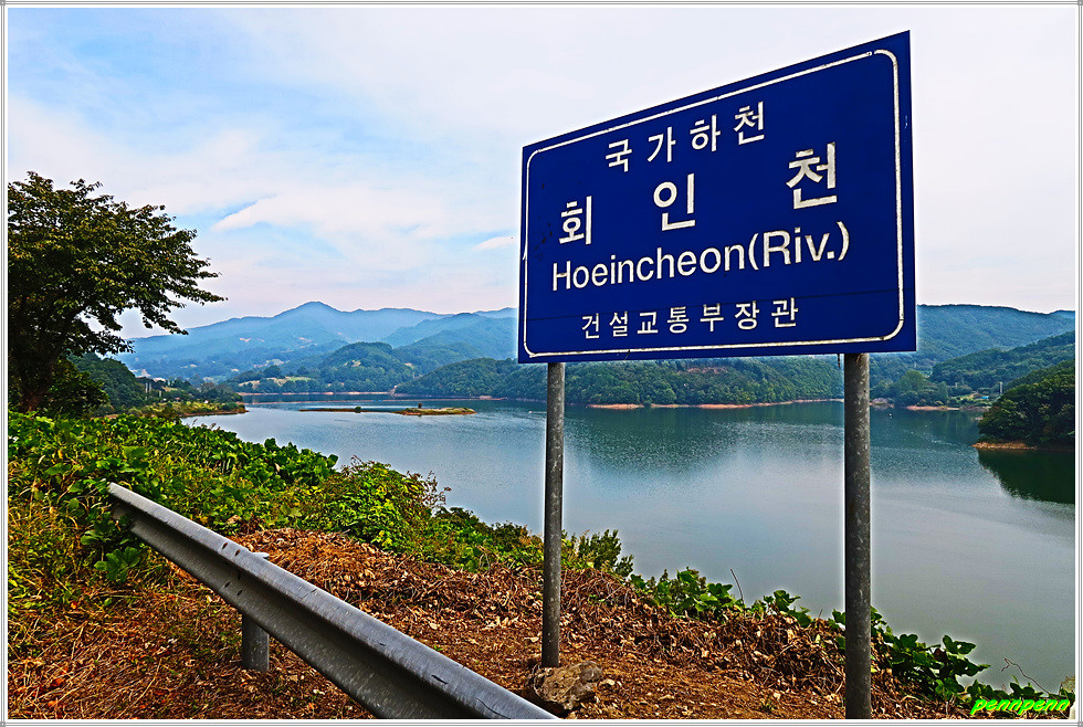 회남대교를 건너 길을 걸으며 신곡리양중지 버스정류장과 양지공원가든을 지나갑니다. 도로변 강은 금강이 아니라 회인천이라고 하네요. 회인천은 원래는 금강으로 흘러드는 작은 하천이었지만 대청댐 조성으로 수량이 풍부해져 국가하천으로 관리할 만큼 큰 하천으로 변모한 듯 보여 집니다. 강변의 숲이 마치 기린처럼 보이는군요. 달빛호수펜션과 판장횟집을 지나갑니다. 이곳은 대청호 물안개가 피는 신곡마을이랍니다.