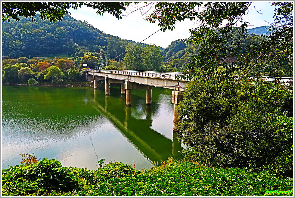 평화롭게 보이는 대청호를 보면서 오동리 주촌마을을 돌아와 다시 571번 지방도로와 만납니다. 토방대.오동 버스정류장을 지나 지방도로 좌측으로 내려서서 문화류씨 묘소를 뒤로합니다. 길을 가면서 내려다보는 붉은 지붕의 건축물과 대청호의 푸른 물이 묘한 대조를 이루는군요. 비포장 임도를 이용해 작은 고갯마루를 넘어 가다가 묘지를 지난 후 잠시 호청호반의 반영을 감상합니다.