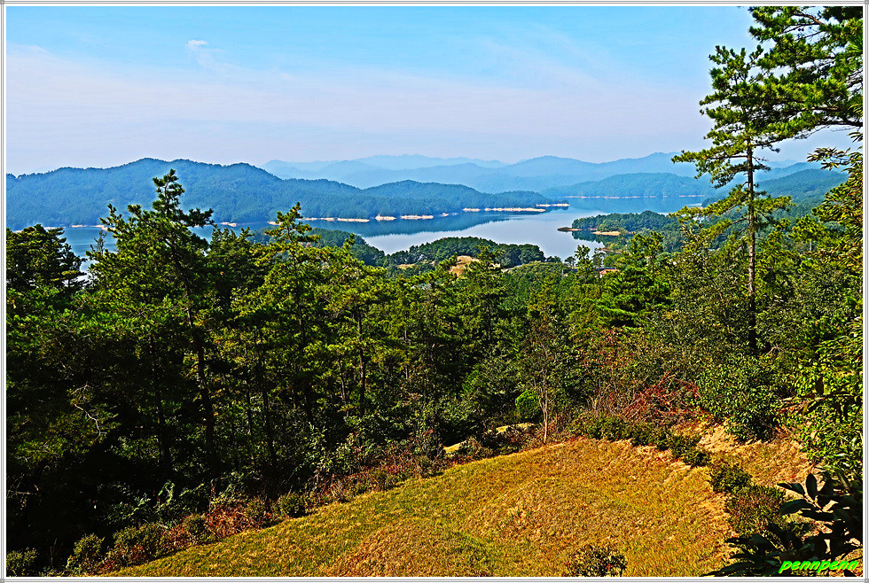 여기서 북쪽의 능선을 따라 3.5km거리에는 국사봉이 있지요. 능선 우측으로 대청호의 모습이 보였다가는 사라지기를 반복합니다. 출발점의 행정구역은 옥천군 군북면이었는데 지금 걷는 이 능선은 대전관역시 동구입니다. 길을 갈수록 능선 좌우로 조망이 보이기 시작하는데 우측으로는 나중에 건너야할 회남대교의 모습이 아련하고, 좌측으로는 대청호의 다른 풍경이 멋지게 펼쳐집니다.