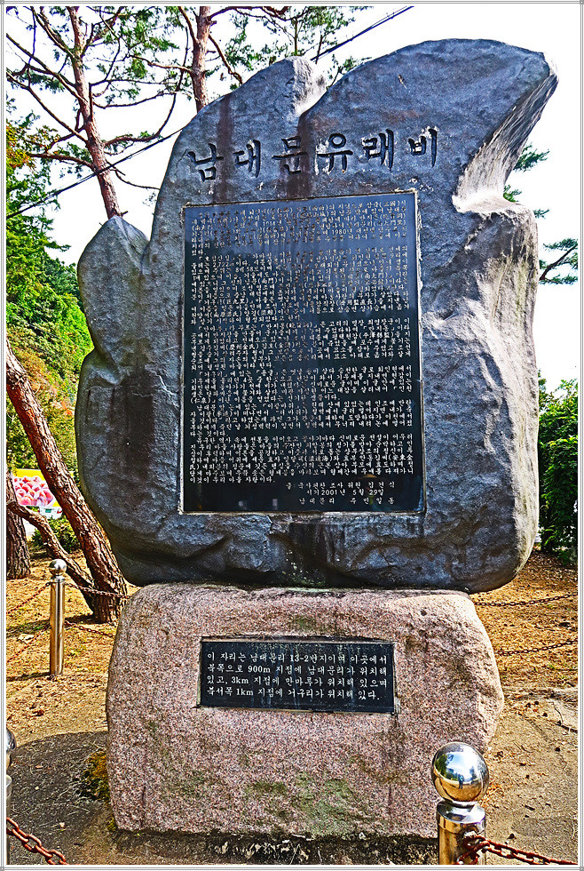 정문공원과 남대문삼거리를 지나 남대문교를 건너면 목적지인 남대문공원입니다. 남대문공원 쪽에는 회남면 수몰유래비가 있군요. 오늘 16km를 걷는데 4시간 반이 소요되었습니다. 대전 소재 국사봉 능선을 걸을 때는 이정표가 잘 되어 있었지만 충북 보은지방으로 들어선 이후 그간 자주 보았던 리본 하나 보이지 않아 길이 헷갈렸고 또 대청호반으로 길을 너무 꼬불꼬불하게 설계해 거리를 늘린 게 아쉬웠습니다. 다만 대추나무길이라는 이름에 걸맞게 법수리의 대추나무농원은 그 규모도 대단했고 시기적으로도 대추가 풍년이어서 정말 반가운 만남이었습니다. 그러고 보면 회남면은 대추나무의 고장입니다.