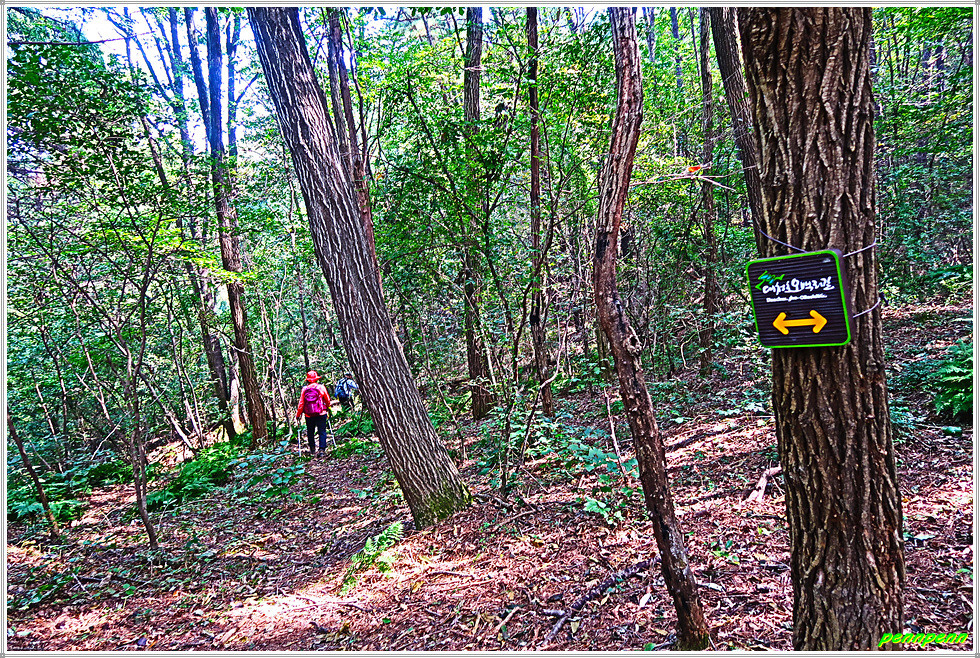 6구간의 들머리는 충북 옥천군 군북면 대정리 소재 와정삼거리입니다. 삼거리에서 동쪽으로 조금 이동한 후 힐호텔 맞은 편 꽃봉 1.7km 이정표를 보면서 민가가 있는 길로 들어서면 바로 숲으로 이어집니다. 숲속 등산로는 이외로 매우 부드러운데, 가끔씩 보이는 조망을 감상하면서 발걸음을 옮기면 꽃봉갈림입니다. 여기서 동쪽인 우측으로 800m 지점에 꽃봉(283m)이 있는데 이는 다음에 답사할 오백리길 7구간(부소담악길)에 포함된 코스입니다.
