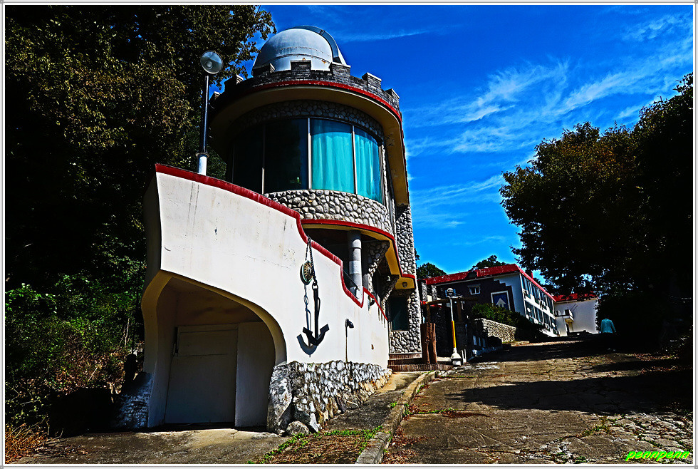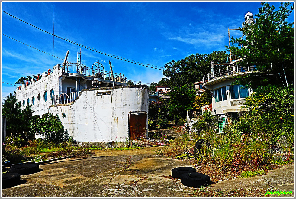 수도원 우측으로 돌아 좌측의 큰 담장을 끼고 오릅니다. 작은 고개를 넘어가는데 숲길 안내도가 세워져 길손에게 큰 도움이 됩니다. 오른쪽 터진 곳으로 석모대교가 보이더군요. 한참을 내려오니 좌측에 강화유스호스텔이 있고 나들길 리본은 양쪽에서 펄럭이지만 우측으로 내려가는 게 바른 길입니다. 잠시 후 큰 도로변에는 강화유스호스텔 입체 이정표가 있는데 그 옆의 시설물도 한 때는 이름을 날렸을 듯합니다.