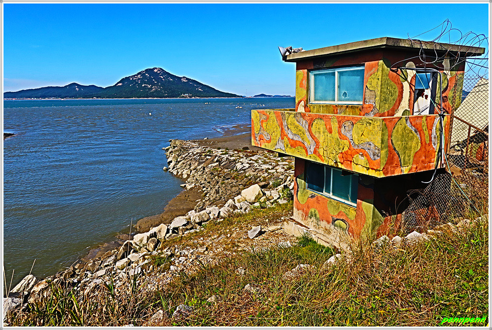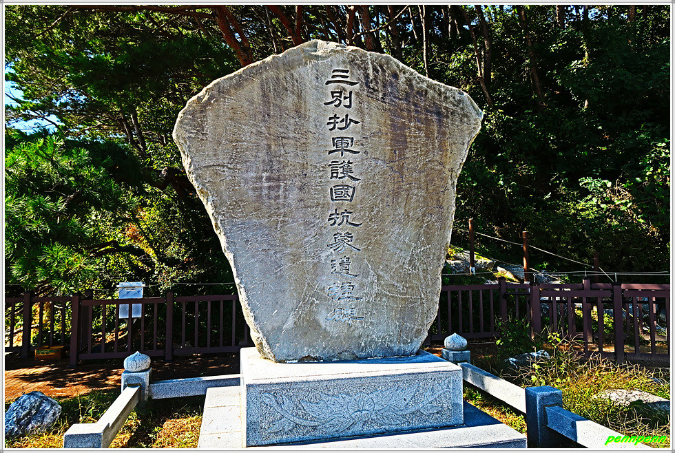 해변에서 석모대교를 카메라에 담은 후 도로를 따라 가다가 우측 민가 쪽으로 들어서면 망양돈대입니다. 강화군 내가면 외포리 소재 망양돈대는 조선 숙종(1679) 때 쌓은 돈대로 해안으로 상륙하는 적군을 처단하기 위해 설치한 중요한 방어시설물이었습니다. 계단을 이용해 돈대를 내려오니 삼별초항쟁비 및 진도군의 진돗개상과 북제주의 돌하르방이 있는데 이는 삼별초군이 항쟁한 3개 군(강화군, 진도군, 북제주군)이 맺은 자매결연에 따라 설치한 상징물입니다.
