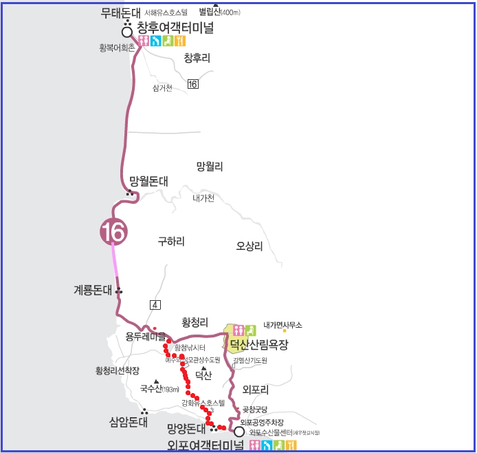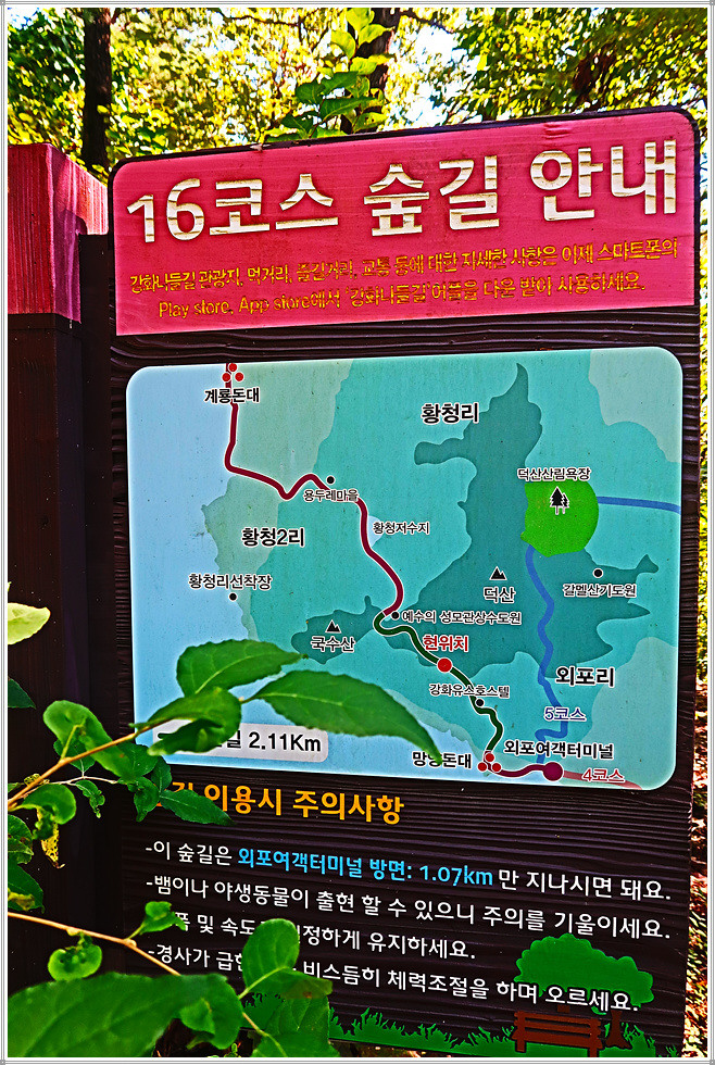 ▲ 코스 : 창후선착장(창후리 버스종점)-망월돈대-내가천-계룡돈대-용두레마을-황청저수지-예수의 성모 관상수도원-국수산 숲길-망양돈대-외포항터미널