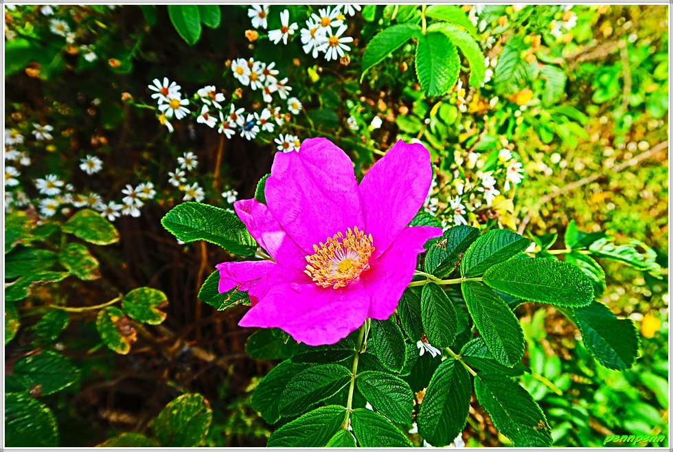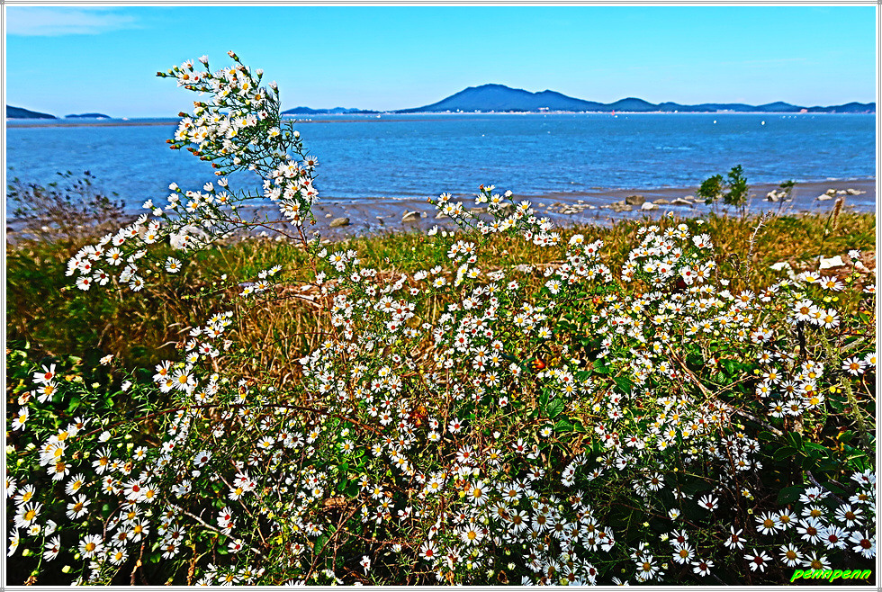 아취형 출입문을 지나니 해당화 한 송이가 아름답게 피어 길손을 반겨주는 가운데 아직까지 개망초가 흐드러지게 피어 있는 모습입니다. 현재 제방의 안쪽에 있는 광활한 평야는 고려말부터 약 800년간 주민들의 노력으로 만들어진 인공평야로서 강화는 우리나라에서 간척사업이 가장 빨리 체계적이며 대규모로 시행된 지역이랍니다. 날씨가 맑아 멀리 북쪽으로 교동대교의 모습이 선명하군요.
