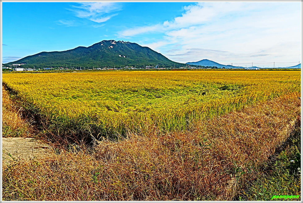 이번 나들길의 목적지는 외포여객터미널인데 이곳 이정표(서해랑길 강화 102코스)는 외포항의 강화파출소로 표기되어 있습니다. 강화나들길 홈페이지에는 16코스의 거리가 13.5km인데 이곳 서해랑길 이정표에는 11km로군요. 동일한 코스인데 거리가 2.5km나 차이가 나는 것은 좀 의아합니다. 우측으로 들어서니 바로 남북으로 이어진 긴 제방길입니다. 동쪽으로는 이웃한 별립산(416m)이 우뚝하고, 서쪽으로는 교동도 최고봉인 화개산(260m)과 석모도의 가장 북쪽에 솟은 상주산(264m)이 암산의 골격을 드러내고 있습니다.