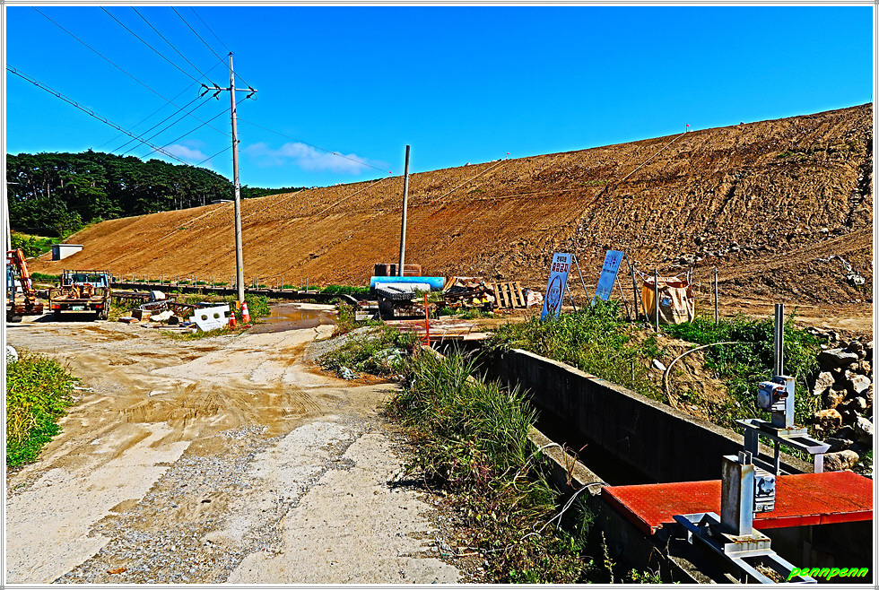 제방 바깥쪽에도 인공적으로 조성한 돌무더기가 자주 보이는데 아마도 파도로부터 제방을 보호하기 위한 것 같습니다. 나들길 사각액자 옆의 쉼터의자에는 누군가 버린 쓰레기(음식물, 맥주병, 비닐 등)가 놓여 있어 눈살을 찌푸리게 만듭니다. 이런 한적한 곳을 찾는 사람들은 그래도 자연을 사랑하는 순례객(걷는 이들)이나 낚시꾼일텐데 어떻게 이들이 이토록 양심에 털난 짓을 하는 지 이해할 수 없습니다.