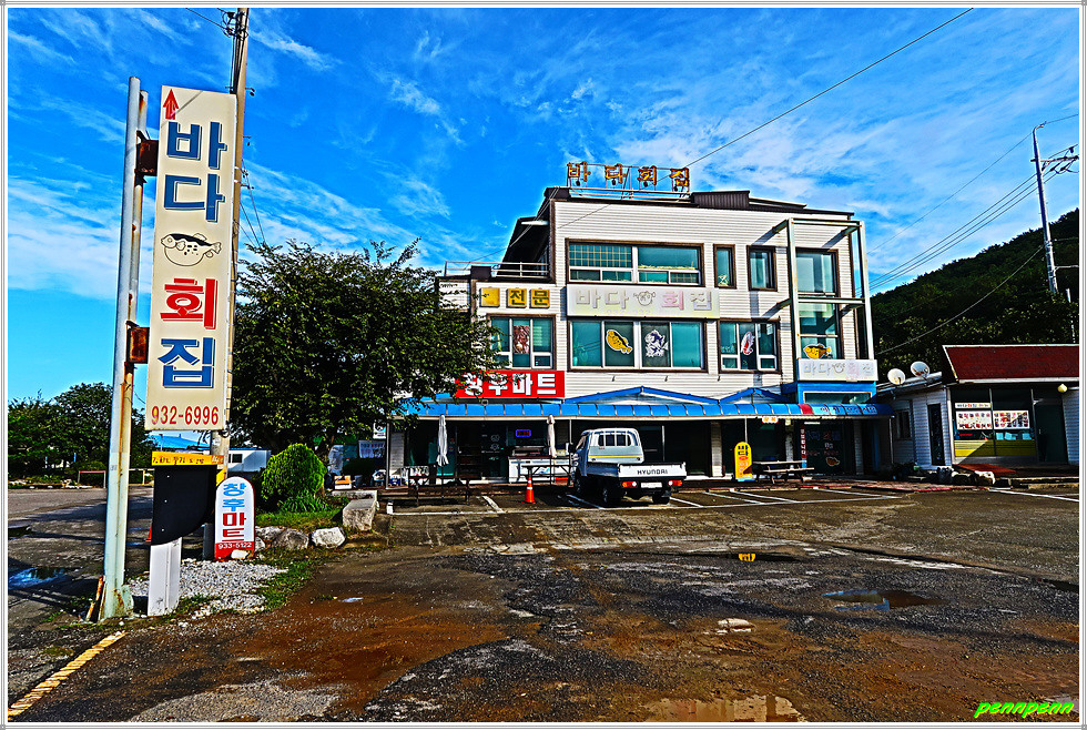 창후리 버스종점 옆에는 강화와 강릉을 잇는 한반도횡단 울트라마라톤 출발점을 알리는 표석과 서해랑길 103코스의 출발점을 알리는 안내지도가 세워져 있습니다. 주차장 쪽 바다횟집 입간판 아래에는 나들길 인증도장함이 있지요. 버스종점에서 남쪽으로 걸으며 살짝 돌아보니 건설중인 2층 복합센터의 규모가 상당히 크게 보입니다.