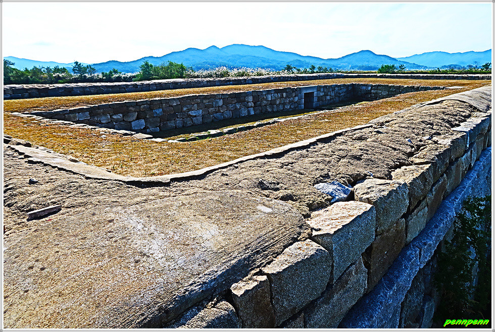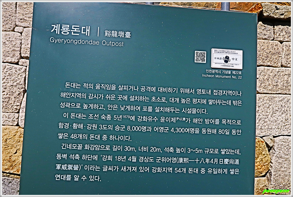 억새가 나부끼는 제방길을 걷노라면 어느새 계룡돈대입니다. 강화군 내가면 황청리에 위치한 계룡돈대는 1679년(숙종 5)에 설치된 것으로 강화 소재 53돈대 중 유일하게 축조연대가 표시되어 있습니다. 계룡돈대는 화강암으로 축조된 장방형(30m×20m)의 돈대로, 한 면의 석축 높이는 2m 정도입니다. 이는 북쪽만이 원형대로 보존되어 있을 뿐, 3면은 파손되어 토성만이 남아 있습니다.