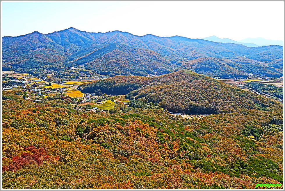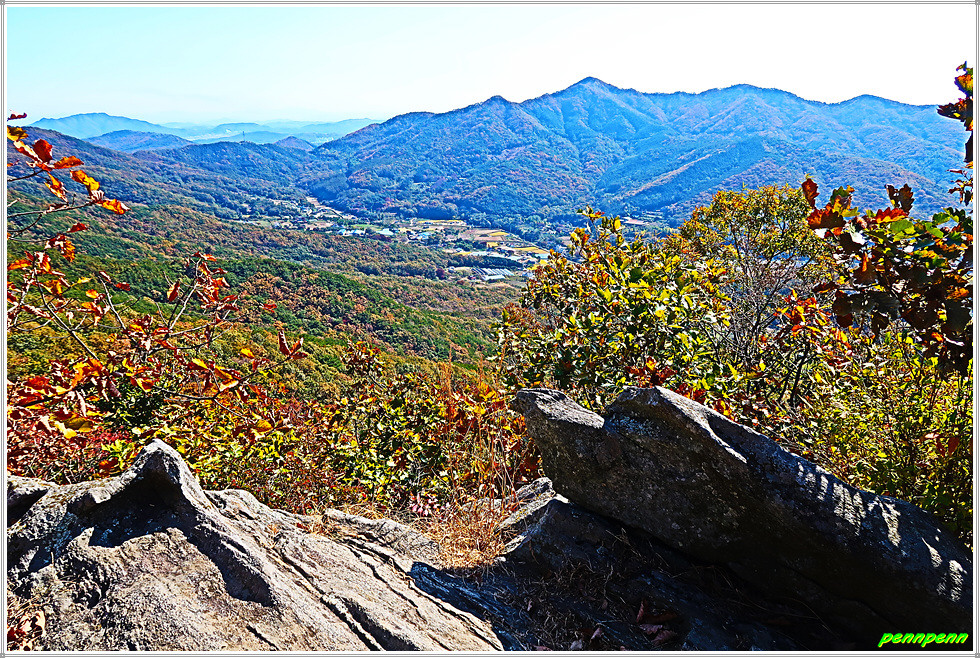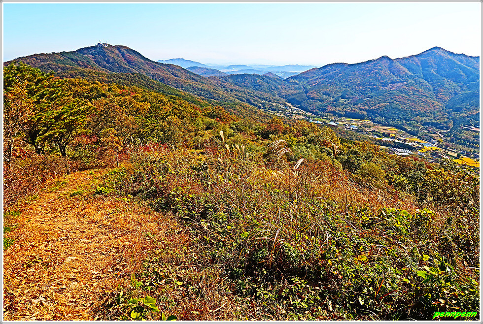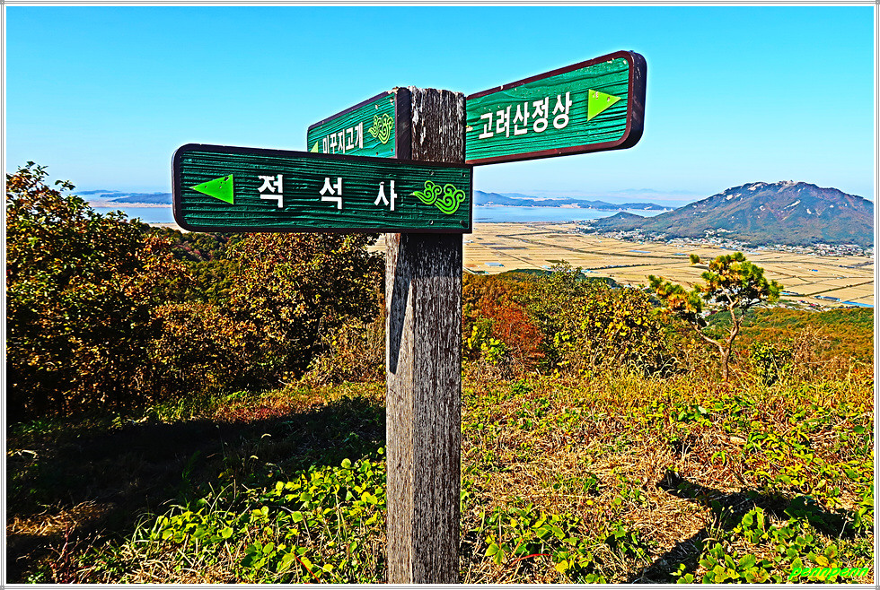고천리고인돌군을 지나 상당히 높은 오르막을 오르면 조망이 터지기 시작하는데 좌측 200m 지점에 적석사가 있다는 이정표가 보이지만 이를 무시하고 직진합니다. 조금 더 가면 바로 유명한 낙조봉(350m)입니다. 낙조봉에서는 동쪽으로는 고려산(436m), 동남쪽으로는 혈구산(466m), 남쪽으로는 멀리 마니산(472m)이 조망됩니다. 북서쪽으로는 별립산(416m)이 우뚝하고 그 뒤로는 교동도 화개산(260m)이 멀어져 있습니다. 또 서쪽으로는 석도모 북쪽의 상주산(264m)이 잘 보입니다.