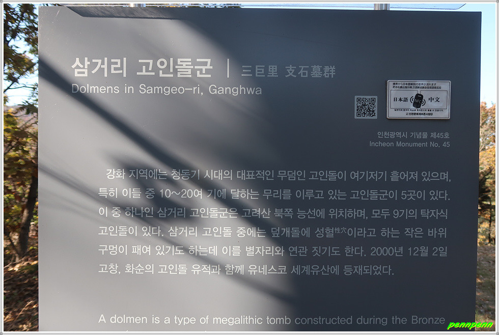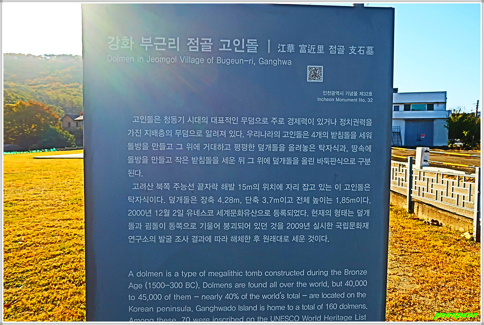 강화나들길 종점표시방향으로 조금 가니 바로 도로변의 고인돌 주차장입니다. 이곳에는 나들길 완주도장함과 버스승차정보가 있습니다. 오늘 10.5km를 걷는데 3시간 남짓 걸렸습니다. 길을 걸으며 전혀 빼 먹은 게 없는데도 공식거리인 12km보다 1.5km가 짧은 이유를 모르겠습니다. 사실 삼거리고인돌군에서 고려산 삼거리 갈림길을 거쳐 낙조봉 및 적석사까지의 길은 나들길이 아니라 등산길이어서 나들길 홈페이지에서도 난이도를 어려운 상(上)으로 분류하고 있습니다. 이번 코스는 고인돌에 대한 감회보다는 낙조봉과 낙조대에서의 멋진 조망이 오래도록 기억에 남을 것입니다.