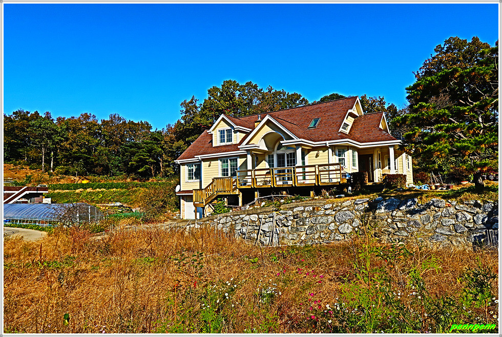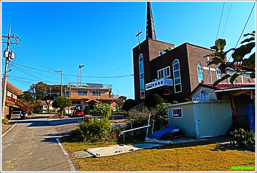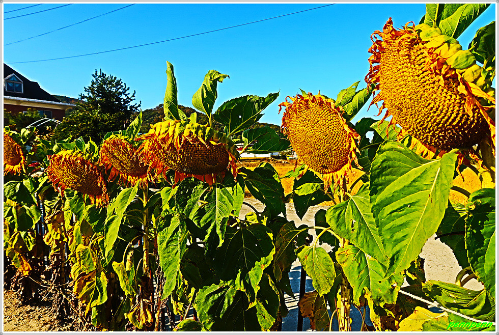 절골고인돌을 뒤로하고 삼거1리 마을표석이 있는 곳에서 좌측 삼광교회 이정표를 보고 마을도로로 들어섭니다. 간혹 멋진 주택이 보이는 가운데 삼광교회에서 좌측으로 몸을 돌려세웁니다. 삼거리 마을에 세워진 삼거정(쉼터)이 있는 곳에는 해바라기가 누렇게 익어가고 있습니다. 그런데 여기서 나들길 공식 이정표는 좌측으로 가야한다고 표기되어 있지만 우리의 목적지는 삼거리고인돌군이므로 직진합니다.