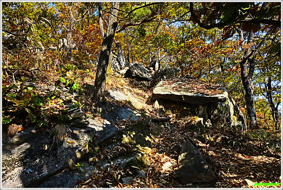 능선에 도착해 좌측으로 오르는 길목에도 고인돌 여러 기가 보입니다. 고인돌을 뒤로하고 한참 동안 오르막을 오른 뒤에야 비로소 고려산 주능선 삼거리에 도착합니다. 여기서 동쪽으로 계속 오르면 진달래명산인 고려산 정상(436m)으로 가는 길이므로 능선을 따라 서쪽의 낙조봉으로 가야합니다. 지금까지의 오르막이 오솔길이었다면 내려가는 이 길은 주능선 길이어서 상당히 반반합니다.