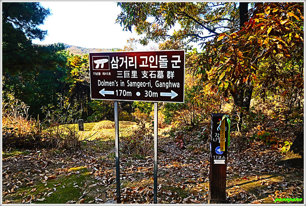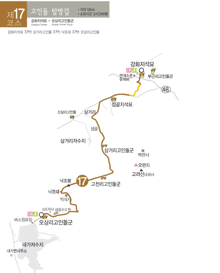 강화나들길 17코스는 “고인돌탐방길”로 강화지석묘에서 출발해 삼거리고인돌군과 고천리고인돌군 및 낙조대(적석사)를 거쳐 오상리고인돌군에 이르는 12km의 도보길로서, 이 코스에서는 유네스코 세계문화유산으로 지정된 부근리고인돌군의 강화지석묘, 탁자식 고인돌이 있는 삼거리고인돌군과 고천리고인돌군 및 오상리고인돌군, 그리고 낙조봉 아래 적석사를 만날 수 있습니다.
